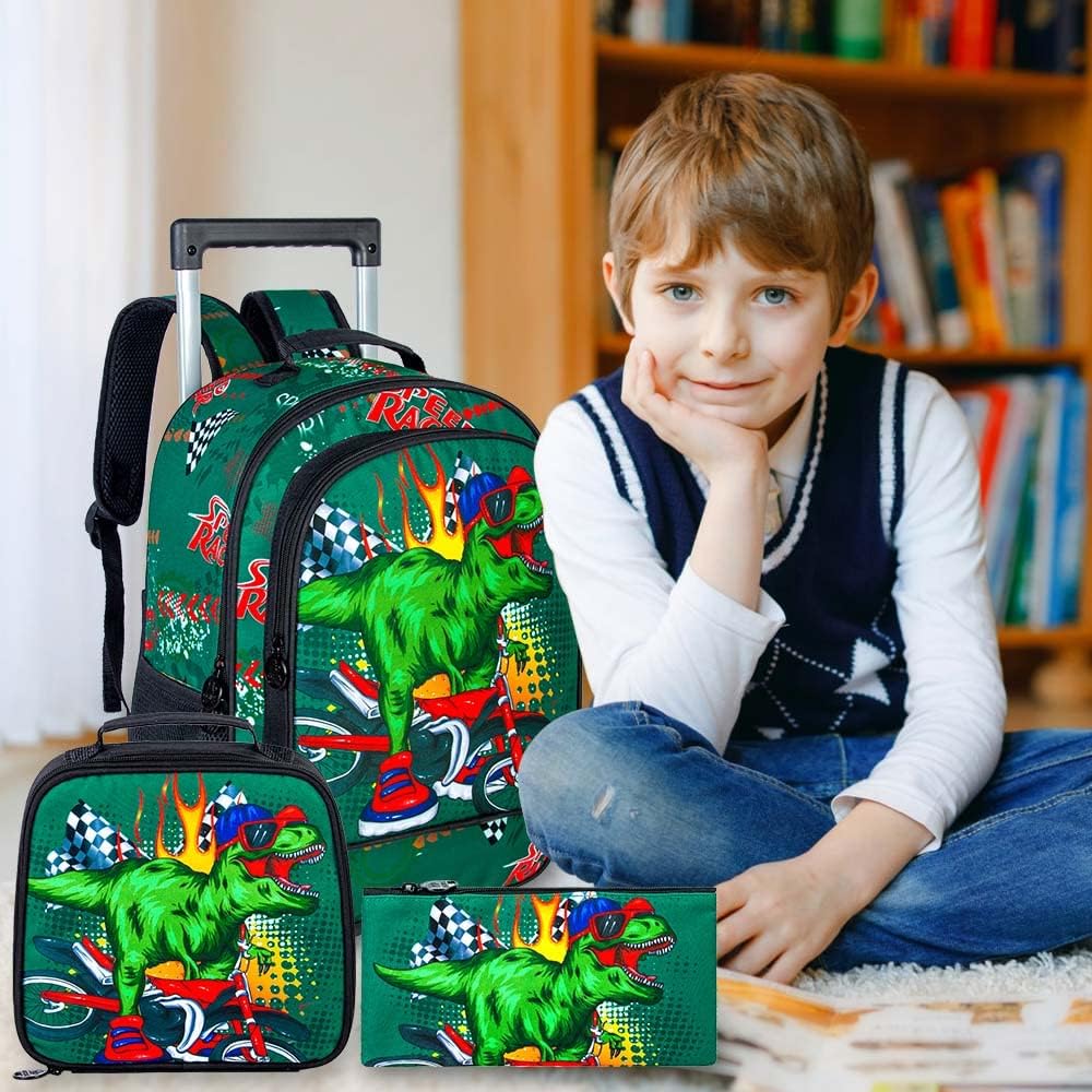 3PCS Kids Rolling Backpack, Dinosaur Wheeled Bookbag for Boys,Travel Roller School Bag with Wheels