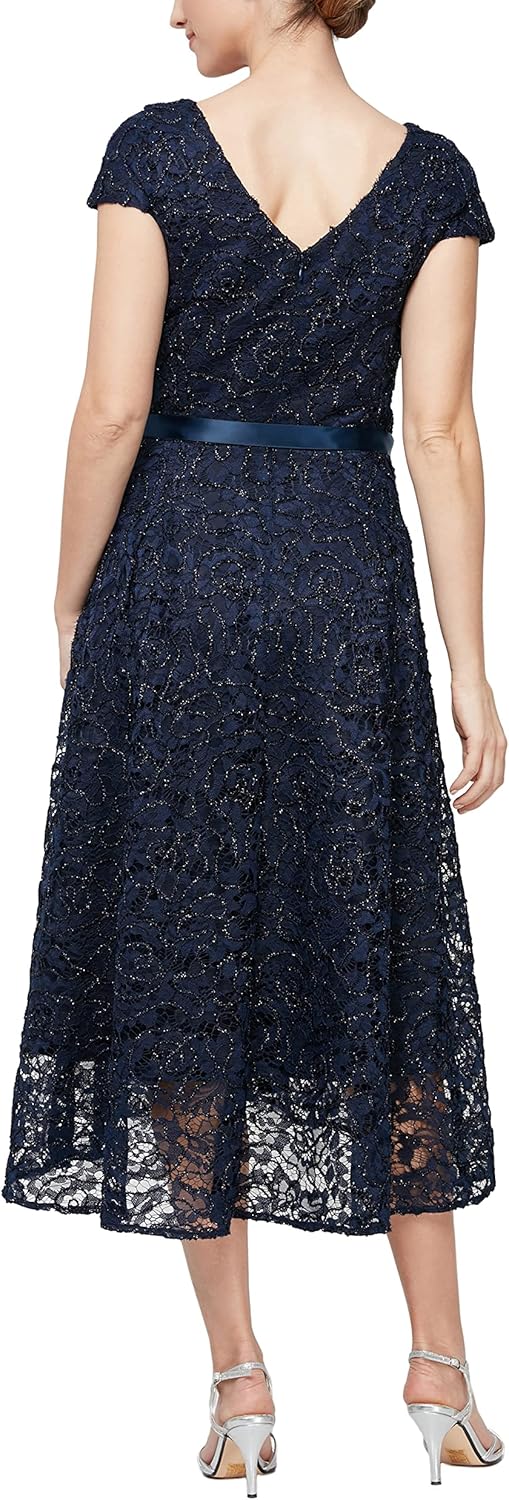 Alex Evenings Womens A-line Stretch Embroidered Dress with Tie Belt