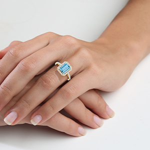 Thanks to its subtle blue hue, an aquamarine ring will pair well with outfits in white, light pink and peach as well as light, medium and dark blue. When it comes to styling, solitaire and classic rings are perfect to flaunt during the day or with your work ensemble. Want to glam up your look for evenings and special occasions? You can choose sparkly aquamarine and diamond halo rings. And to stay on-trend wherever you go, pick contemporary styles, initial rings or gorgeous stackable aquamarine rings that you can pair with other pieces in your collection.