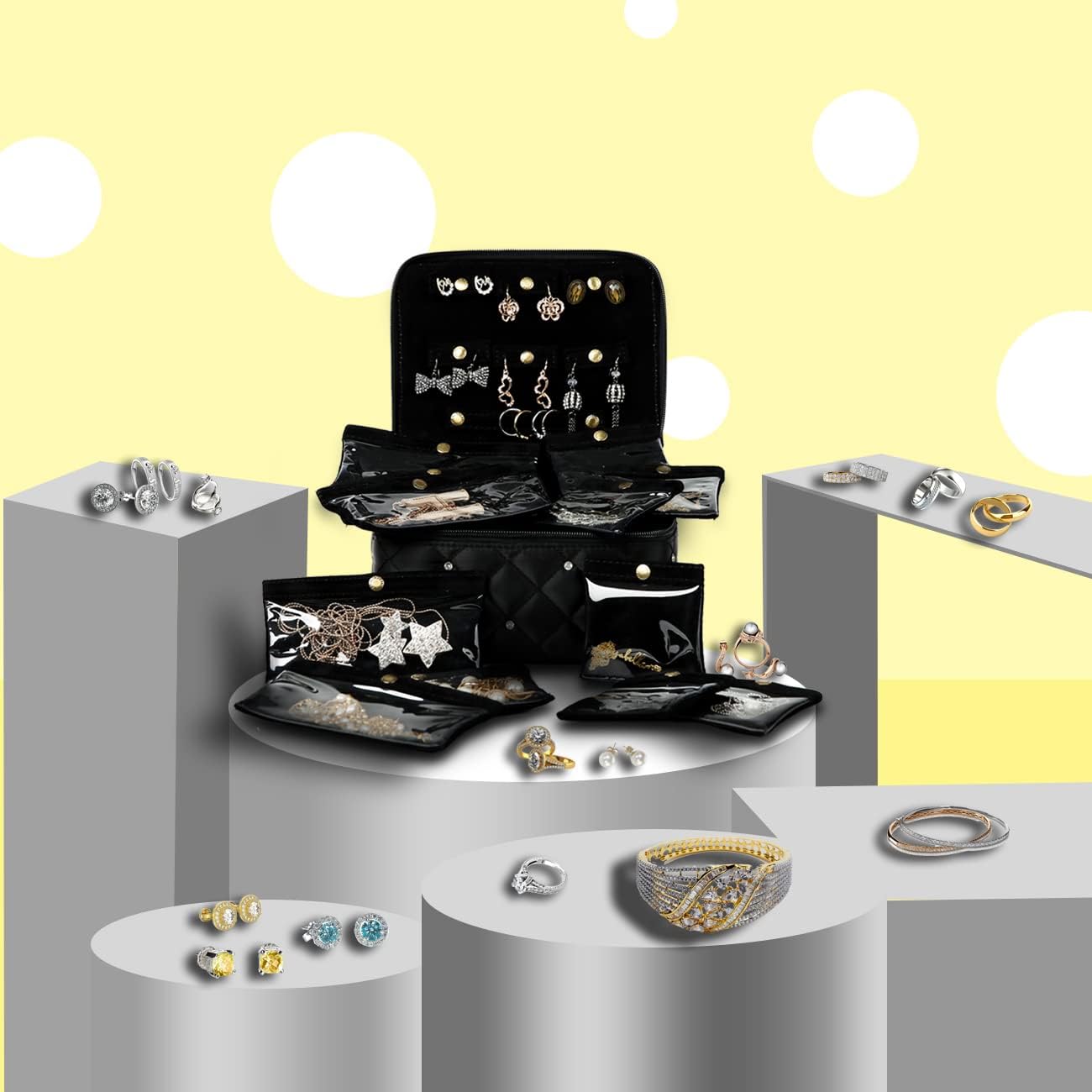 PACK IN STYLE–The interior features 6 earring bars and one ring bar for 6-9 rings behind the lid – perfect for storing your earrings and rings that are easy to access. A spacious main compartment with 16 see-through jewelry pouches in 2 sizes that keep necklaces and bracelets separate and secure.