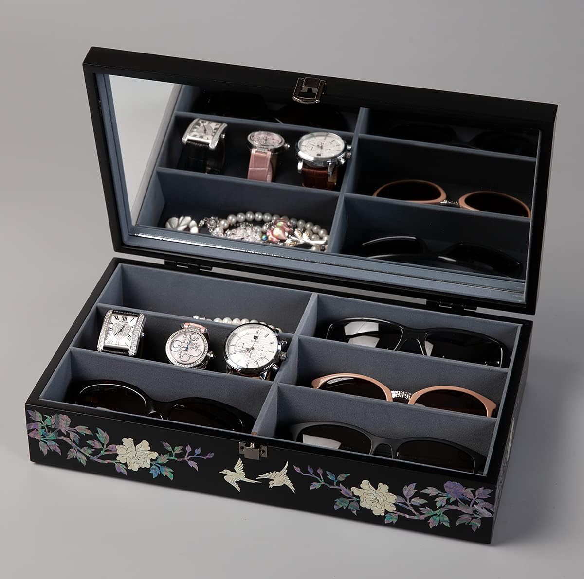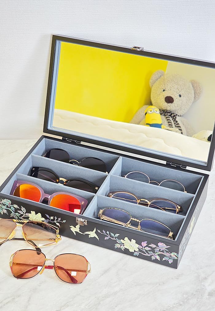 Be the first to review “Antique Alive Mother of Pearl Handmade Korean Wood Sunglasses Box Eyeglasses Valet Display Storage Case for 6 Pairs of Glasses, Watches, Jewelry, Trinkets – Wooden Accessory Organizer Gift for Men & Women (Peacock Black)”