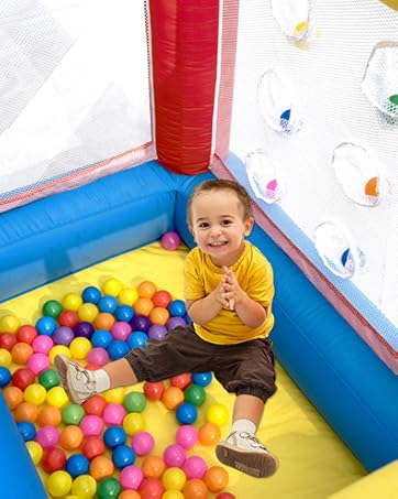 【6 in 1 Bouncy House】 Trampoline + Climb Wall + Slide + Ball Pit or Water Pool + Basketball Slam Dunk Hoop + Soccer Shot. A versatile play center that combines the excitement of a jumping house, the challenge of a climbing wall, the thrill of a slide, the action of a basketball hoop, the interactive fun of an ocean ball pool, and the competitive spirit of a soccer goal—all in one inflatable space. This all-inclusive design ensures that your kids can enjoy a range of activities that cater to their diverse interests and energy levels.