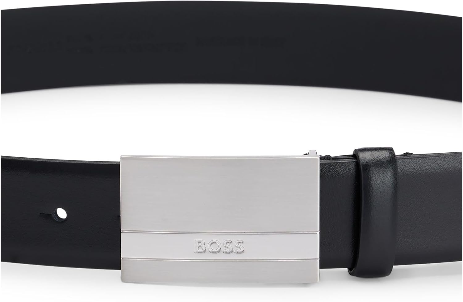 Boss Baxton Leather Belt with Logo and Engraved Plaque Buckle is for Men, it featuring a logo-engraved plaque buckle in a combination of brushed and polished effects. Crafted from leather for a rich look and feel, it is ideal for casual or workwear and the premium quality material ensures long lasting durability. It’s ergonomically designed for superior grip. Comes in size 105 size and 001 black color.