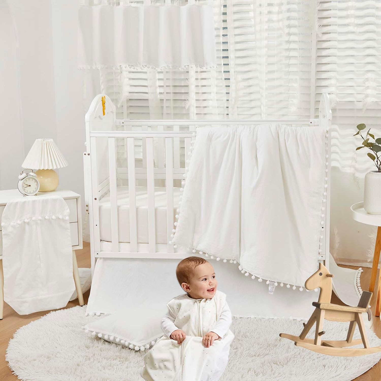 Brandream Gender Neutral Boho Bohemian Baby Girl Boy Nursery Crib Bedding Set 3 Pieces Solid White Farmhouse Chic Unisex Minimalist Tassel Pom Pom Macrame Cozy 100% Washed Cotton