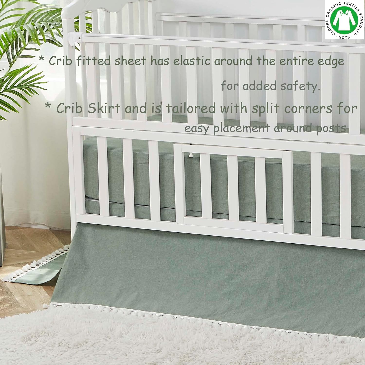 Brandream Gender Neutral Boho Bohemian Baby Girl Boy Nursery Crib Bedding Set – 6pc – Solid Color Sage Green Farmhouse Chic Unisex Minimalist Tassel Fringe Macrame 100% Washed Cotton