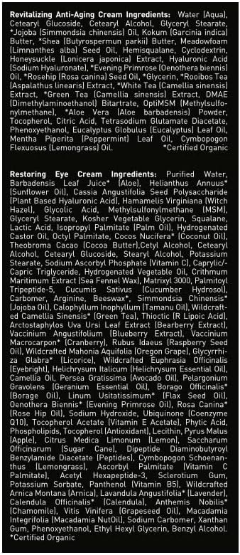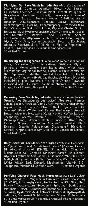 Key Ingredients: Natural & Certified Organic ingredients, including aloe, caffeine, DMAE, MSM, protein peptides, hyaluronic acid, coconut cleansers, pumice, jojoba beads and green tea.