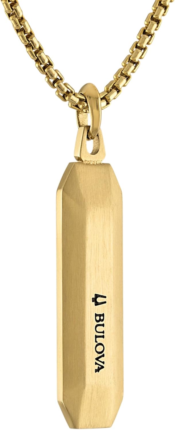 An elongated dog tag amulet made of gold-tone stainless steel prominently features tiger’s eye, a highly motivational gemstone representing power, fearlessness and courage. Rounded box link chain necklace in gold-tone stainless steel adjusts from 24″ to 26″ with extender ring and tuning fork shaped clasp. Pendant is subtly etched with Bulova’s iconic logo and measures 40MM L x 11MM W.