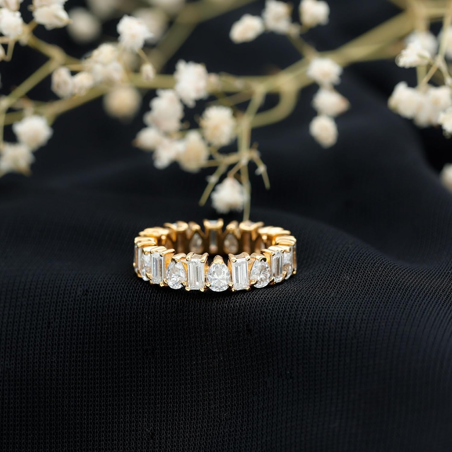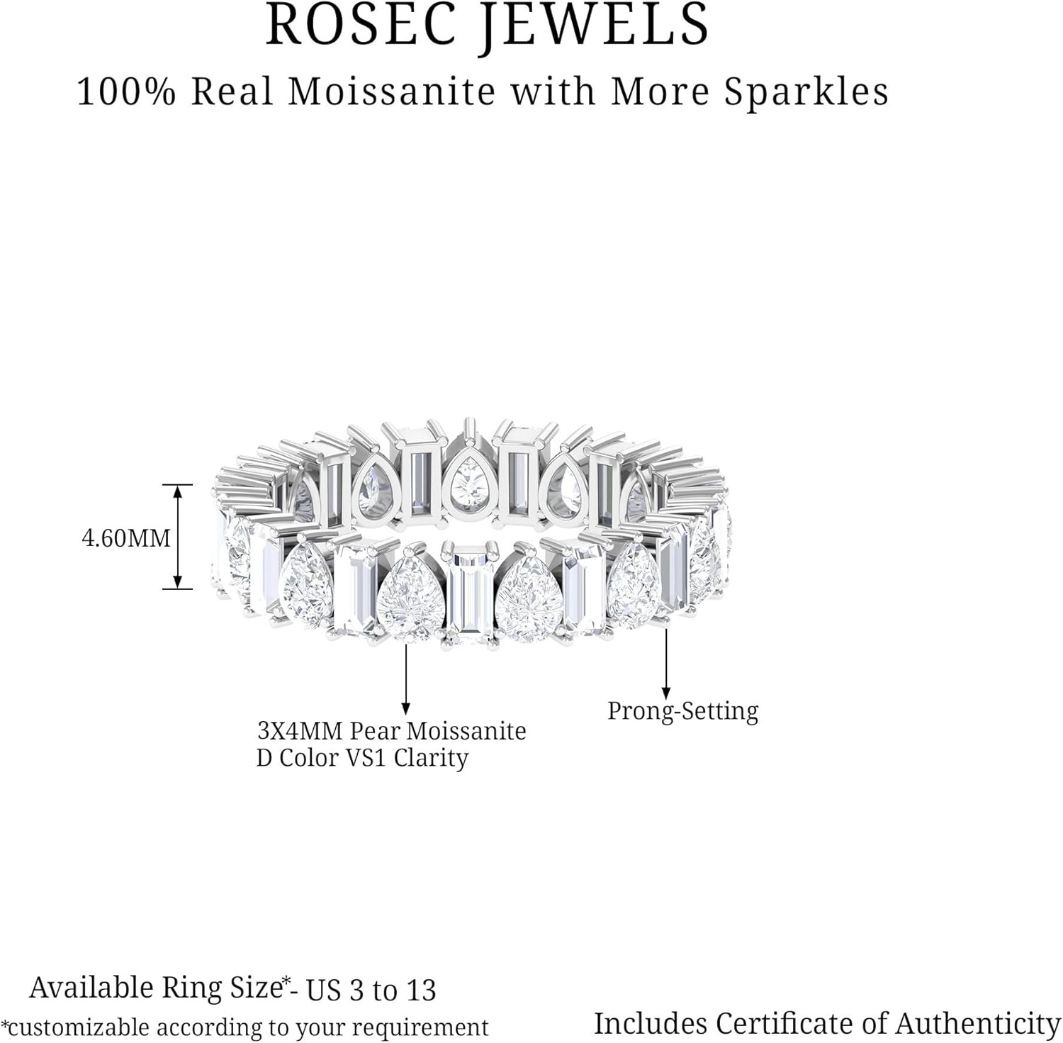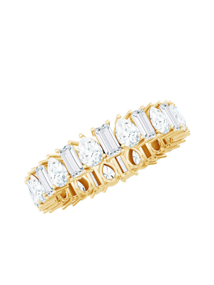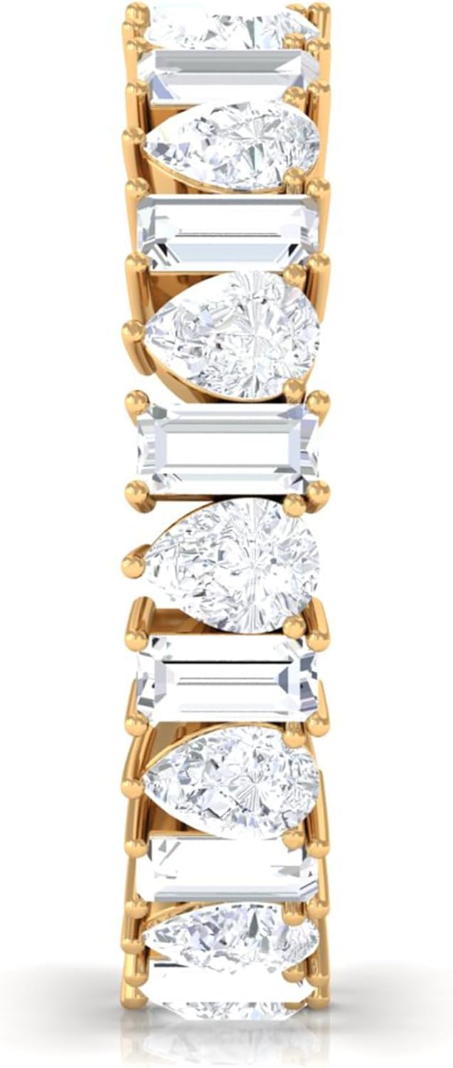 How one can resist the dazzling aura of this Full Eternity Band for her? Composed of Precious Metal, this Eternity Band highlights the Pear and Baguette Shape Moissanite which is flaunting in a consecutive alternating pattern. When you give this Moissanite Band Ring to her it will create a wonderful memory for a lifelong time. The ring carries a total weight of 3.50 Carat with the quality of D Color VS1 Clarity. All our gemstones are certified and undergoes strict quality check.