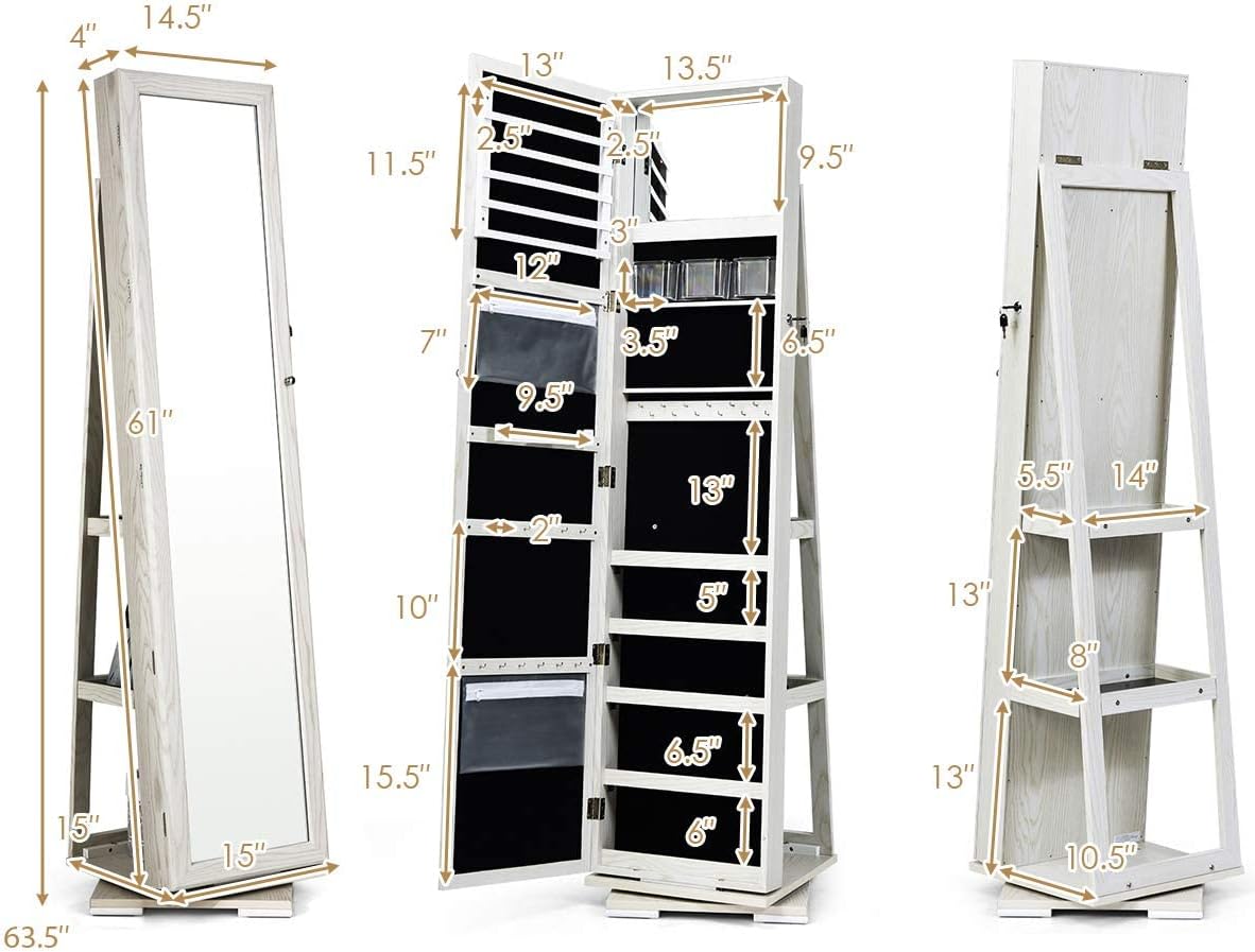 [2-in-1 Mirror Jewelry Armoire]: Enjoying the dual benefits of jewelry armoire and mirror in one cabinet, this freestanding jewelry cabinet will give you endless fun of dressing up. Extended long mirror offers you a head-to-toe view of your outfit in real image and you can storage all jewelry in order with this jewelry armoire.