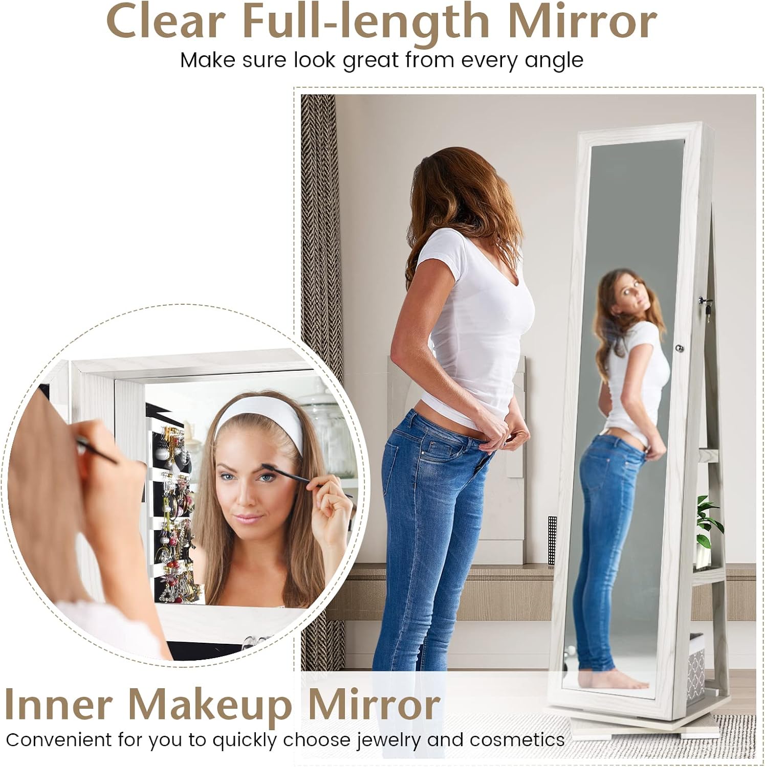 COSTWAY 360 Rotating Jewelry Armoire Cabinet, Standing Jewelry Organizer w/Full-Length Mirror & Large Storage Space, Lockable Mirror Jewelry Cabinet for Girls Women (White)