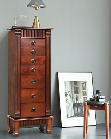 [Exquisite Design with Fine Craftsmanship]This walnut-colored jewelry chest has a strong vintage charm. Antique metal handles and hooks are both beautiful and durable to highlight your jewelries. Additional features like soft lining, magnetic door suction, crash pad, smooth and polished cabinet surfaces all reflect exquisite craftsmanship.