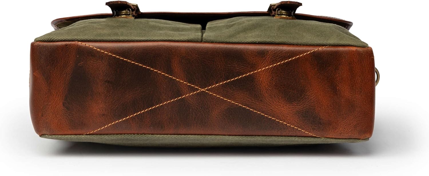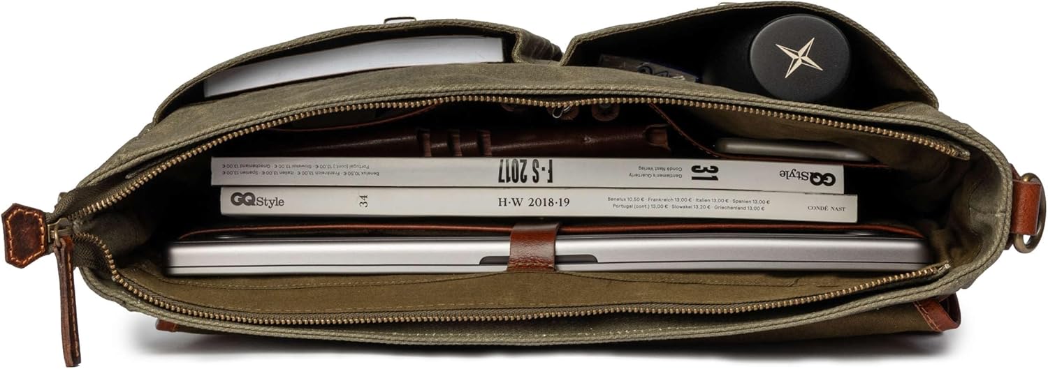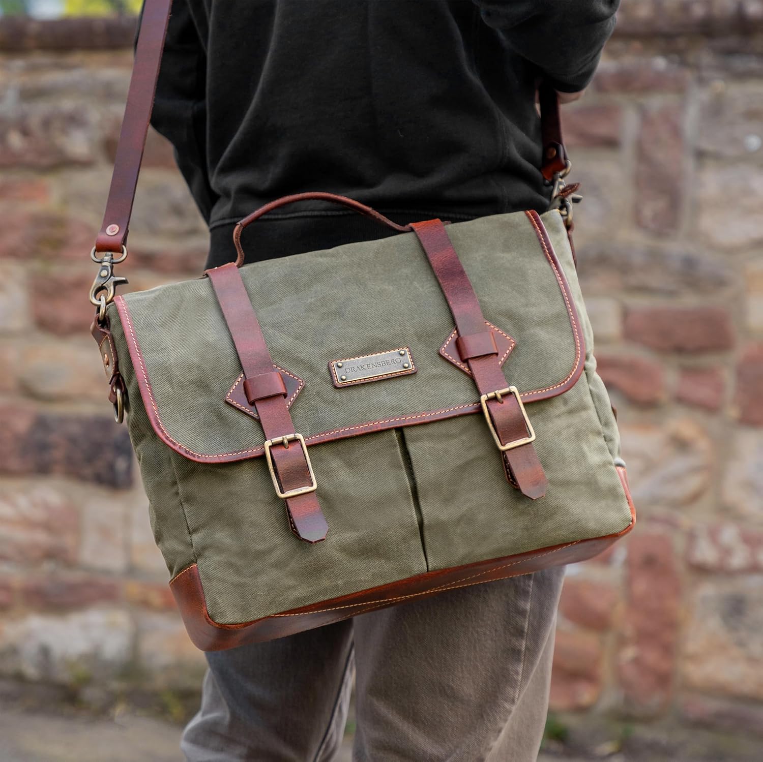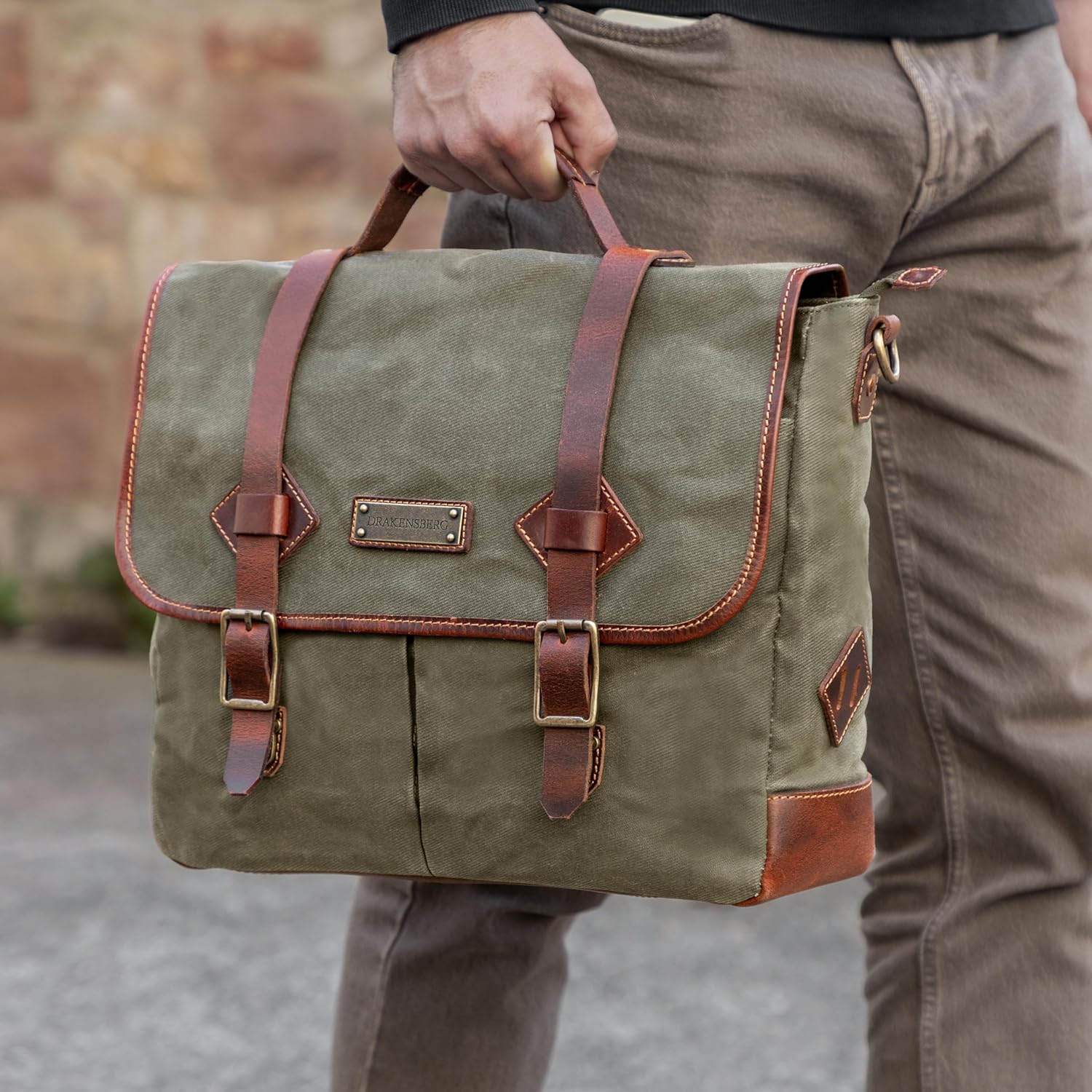 DRAKENSBERG ‘Marty’ Men’s Shoulder Bag with 15 Inch Laptop Compartment, Waxed Canvas with Leather, Water-Repellent Briefcase, 14L – Forest Green, DR00623, Forest green.