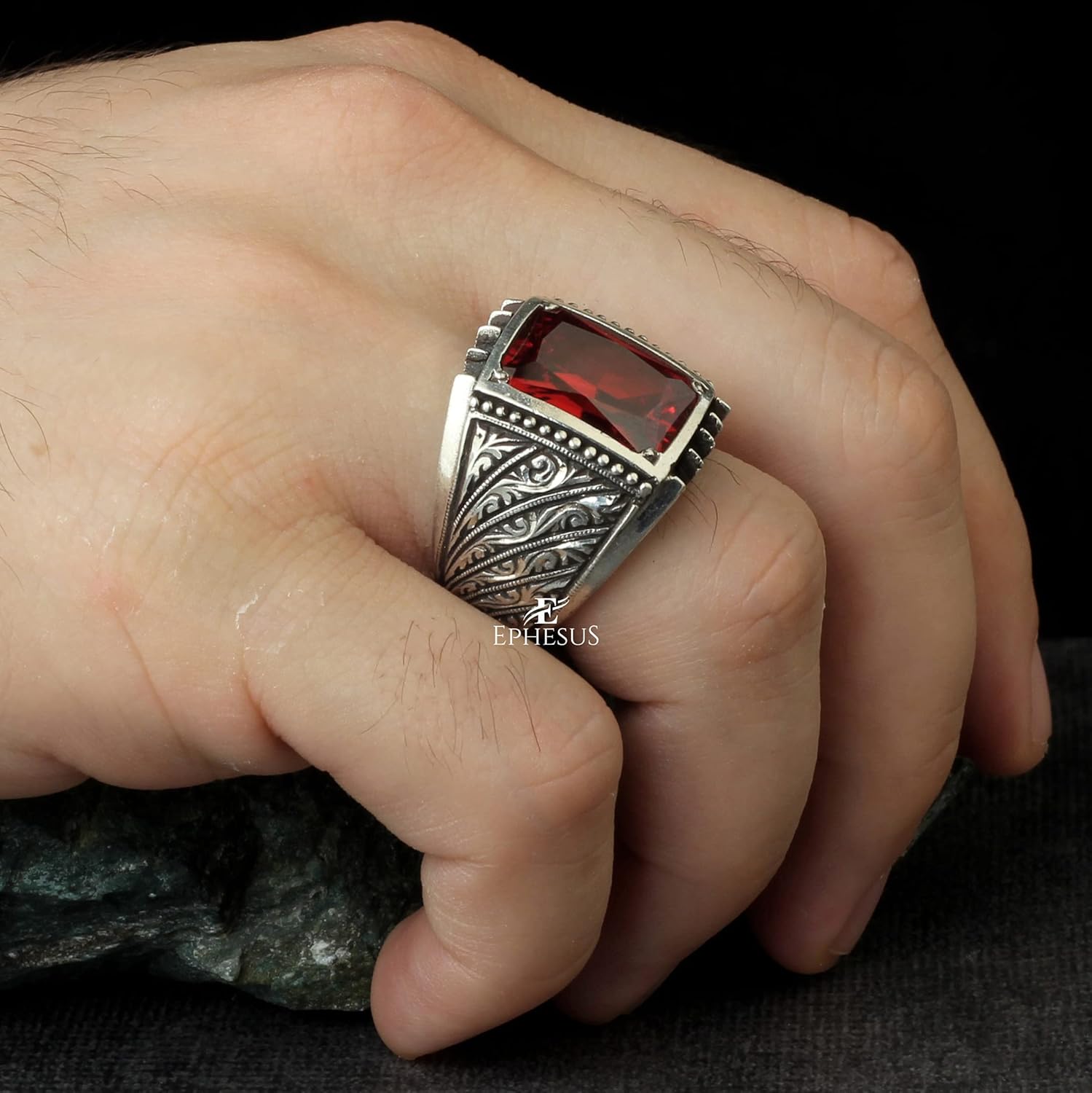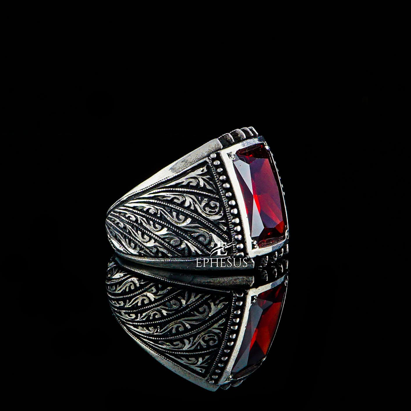 Emerald Cut Garnet Ring, Garnet Stone Ring, Sterling Silver Garnet Ring, Elegant Garnet Ring, January Birthstone Ring, Classy Garnet Ring — Garnet ring offers you unique hand engraved motifs made in the old fashioned way, with care and with the same techniques as were used 100 years ago. Hand engraved metal creates tiny sharp details and reflects the light in differing ways which will not go unnoticed. This unique jewelry making method requires long years of practice and does not accept even the slightest mistake. However, our master silversmith with +25 years of experience showcase his excellent craftsmanship in this elegantly designed statement ring with the finest details. — STONE INTRODUCTION — Garnet is the birthstone for January and the stone that celebrates the 2nd anniversary of marriage. A spiritual stone of higher thinking and self-empowerment, and is a talisman of protection and unyielding strength, increasing willpower and resistance to all things negative. Associated with the First Chakra, it is a stone of physical love and relationships.