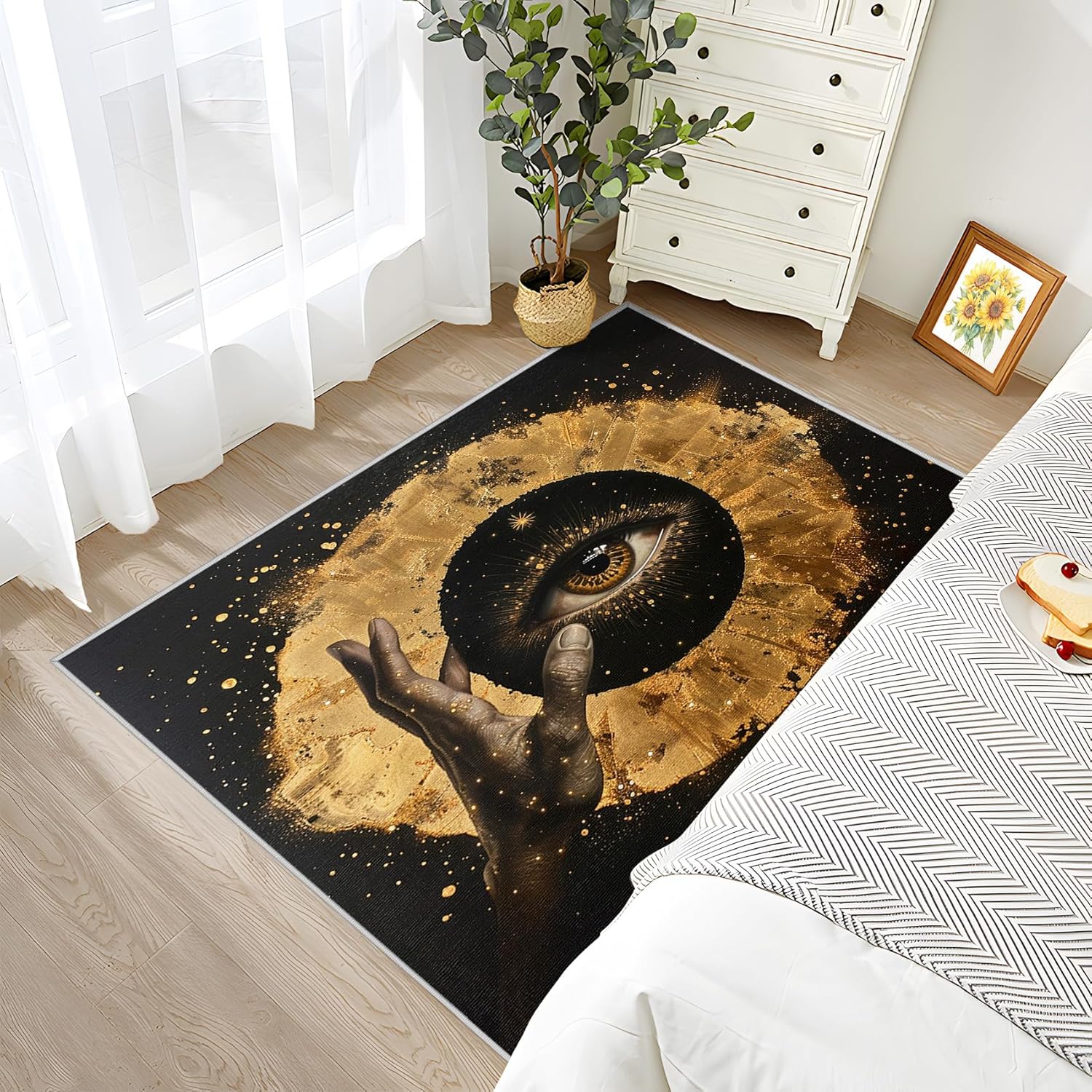 Evil Eye Rug Indoor – 7×10 Rug, Black and Gold Rugs – Home Decor, Golden Meditation Washable Rugs for Living Room Bedroom, Spiritual Area Rug, Psychedelic Art Carpet, Evil Eye Gifts for Women