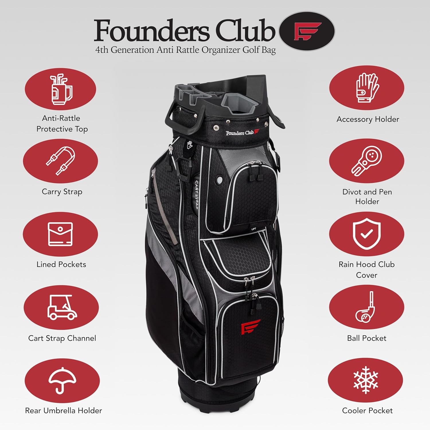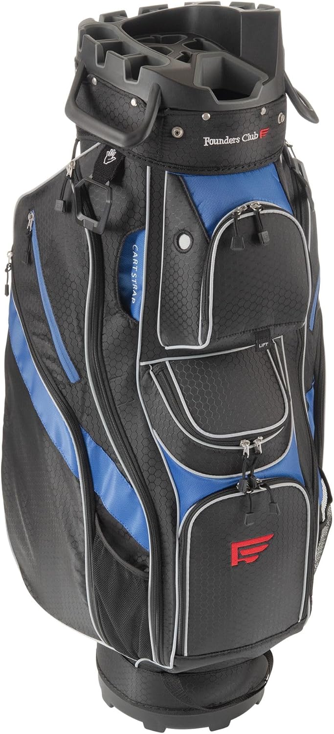 For 35 Years Founders Club has made innovative golf equipment to help make each golf round more enjoyable than the next. The Founders Club 4th Generation Club Lock Organizer Cart Bag offers unparalleled protection for your golf clubs. Its 14-Way divider system assigns each club a protective rubberized slot, keeping shafts and grips separated and eliminating club rattles and damage. Golfers will appreciate knowing the exact location of each club and whether they left a club behind. The bag features larger openings to fit Midsize and Jumbo Iron and Wood grips, and a recessed area for woods, allowing more room for longer wood and hybrid head covers. The Founders Club Premium Cart Bag includes all the premium features expected from a top-tier Cart Bag at an excellent price. Whether you’re driving a motorized golf cart or using a pushcart, this bag is ideal. It even has an Ice Pocket for chilled beverages and a fur-lined pocket to safely store your phone, watch, and valuables.