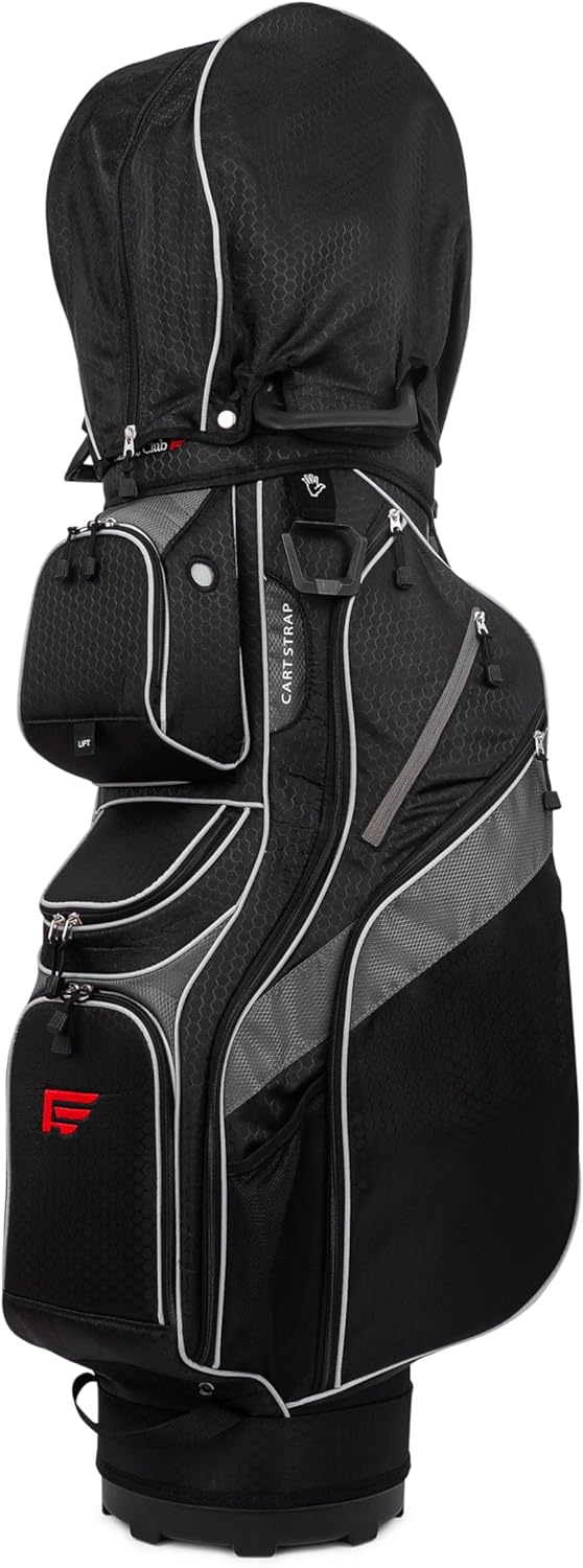 (High Quality lightweight construction) – This cart bag comes with a large, reinforced and sturdy base and several handles to make lifting your clubs out of the trunk and onto your cart a breeze. The bag comes with 2 integrated side grab handles and a bottom handle built into the cooler pocket. It also has a rear grab handle and a tuck away padded carry strap. The Cart Bag also includes a strap channel to secure your bag and clubs to your cart.