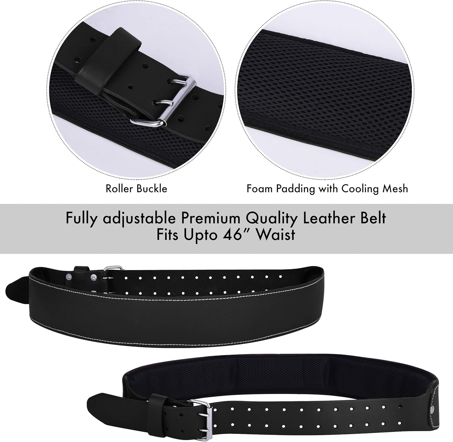 Belt is padded with 2-inch thick Foam and Cooling Mesh to give you maximum comfort. It can fit from Size 29-inch up to 47-inch waist size. (Over the Cloths.) . Sewn with 9Ply Nylon Thread