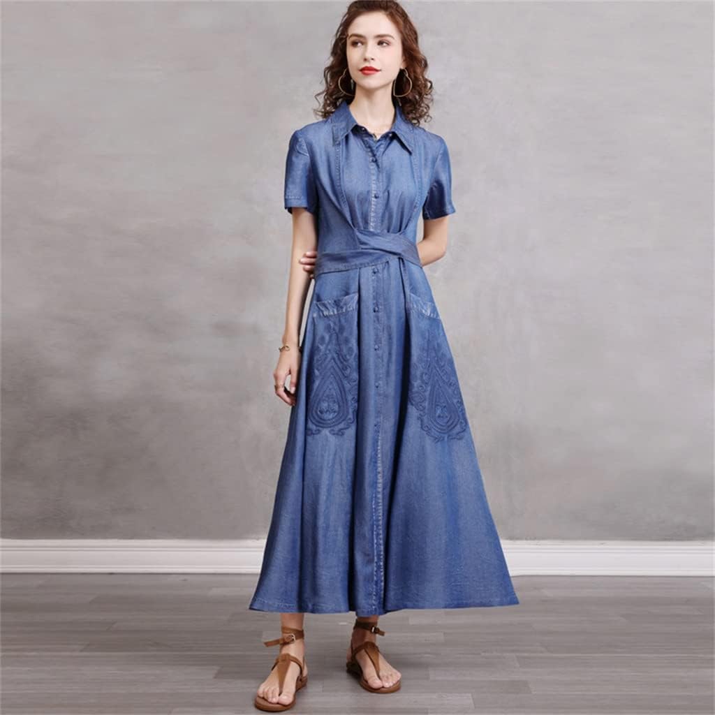 GAELOP DFHBFG Women Denim Dress Vintage Embroidery Turn-Down Collar Short Sleeve Belt Clothing Pocket Dresses(Large) Blue