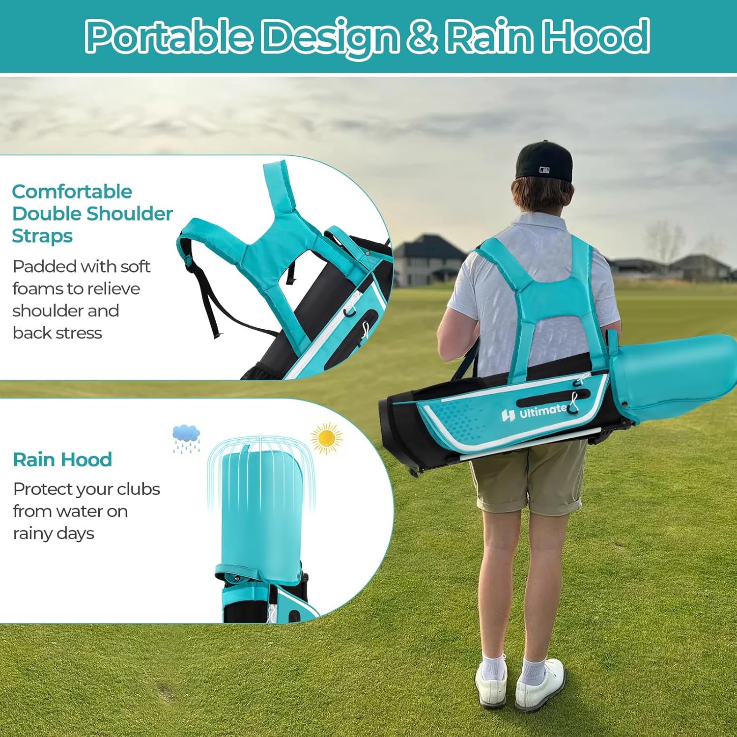 🎁【Lightweight Stand Bag】 The stylish golf stand bag is built with ample storage space for all the clubs and accessories, including a 4-way top organizer, a towel holder, a waterproof valuable pocket, a full-length apparel pocket and a mesh pocket. The included rain hood provides added protection for clubs during inclement weather. And the dual shoulder straps make carrying easy.