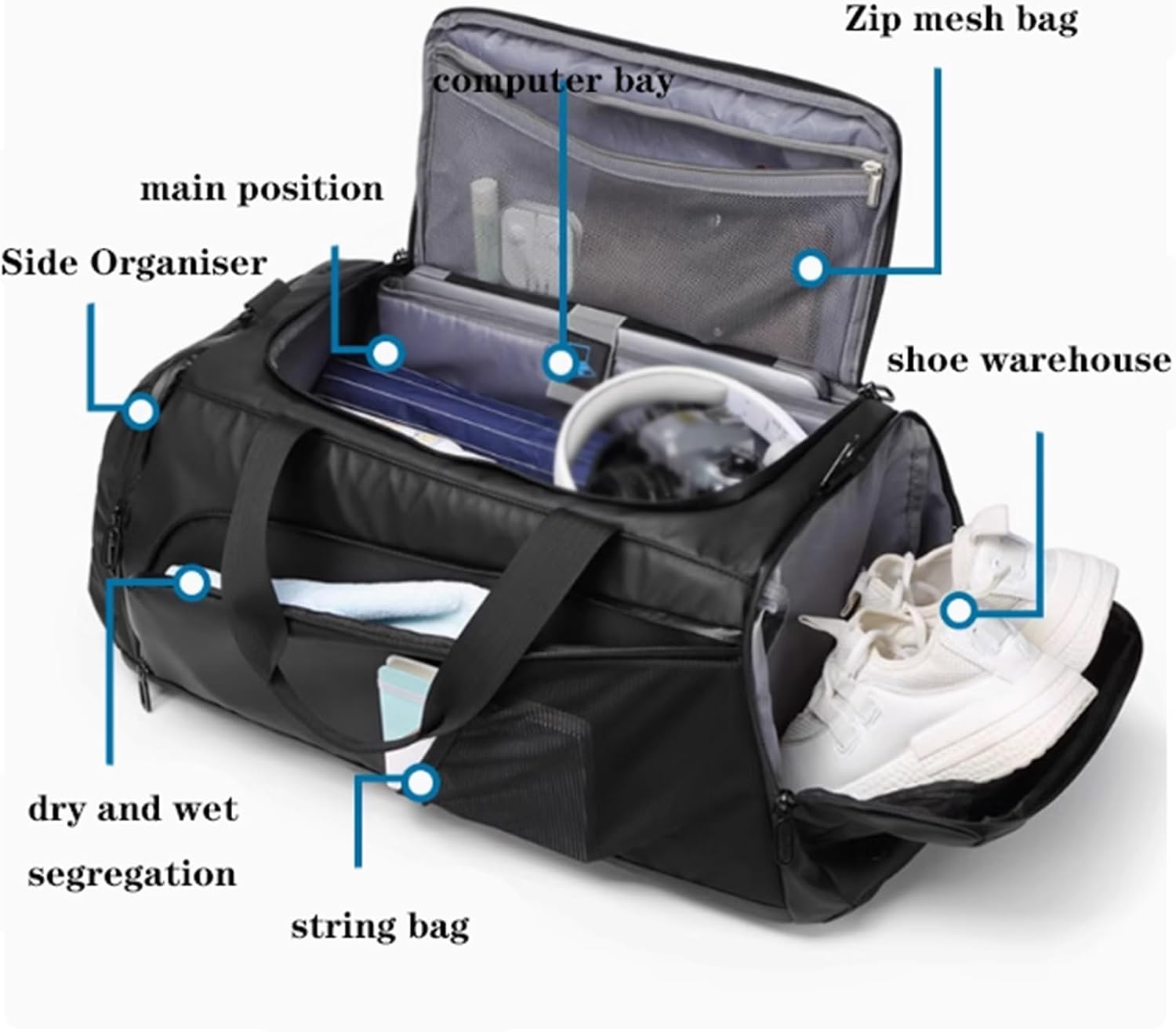 Dry Wet Separate Duffel Bag, This duffle bag for women offers a spacious main compartment to store your clothes and items. And this bag can store towels, cosmetics, clothes, food, drinks, Side storage for shoes