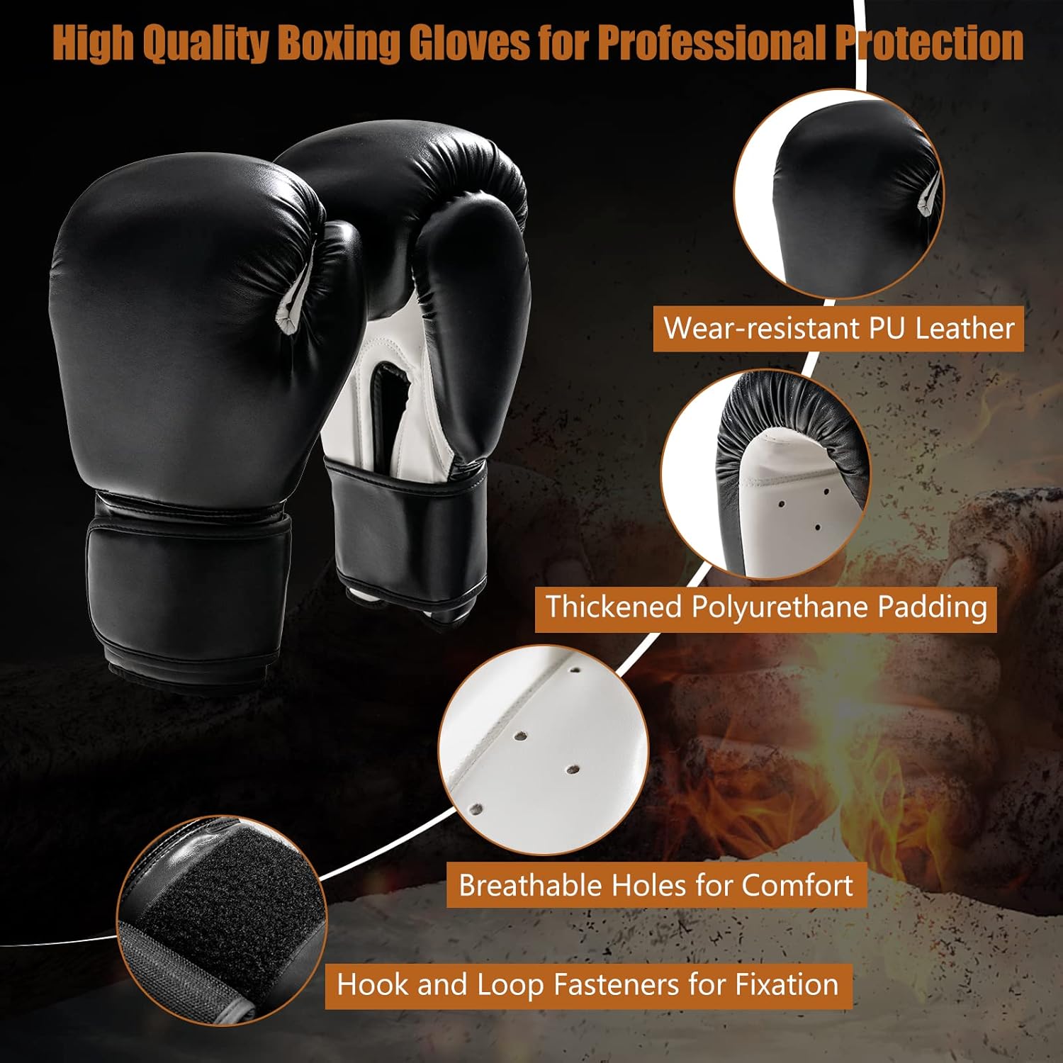 High Quality Boxing Gloves: To give you professional protection, a pair of premium boxing gloves is included. And it is made of wear-resistant PU leather and thickened polyurethane padding. Besides, the boxing gloves feature hook and loop fasteners for secure fixation and vent holes for upgraded comfort.