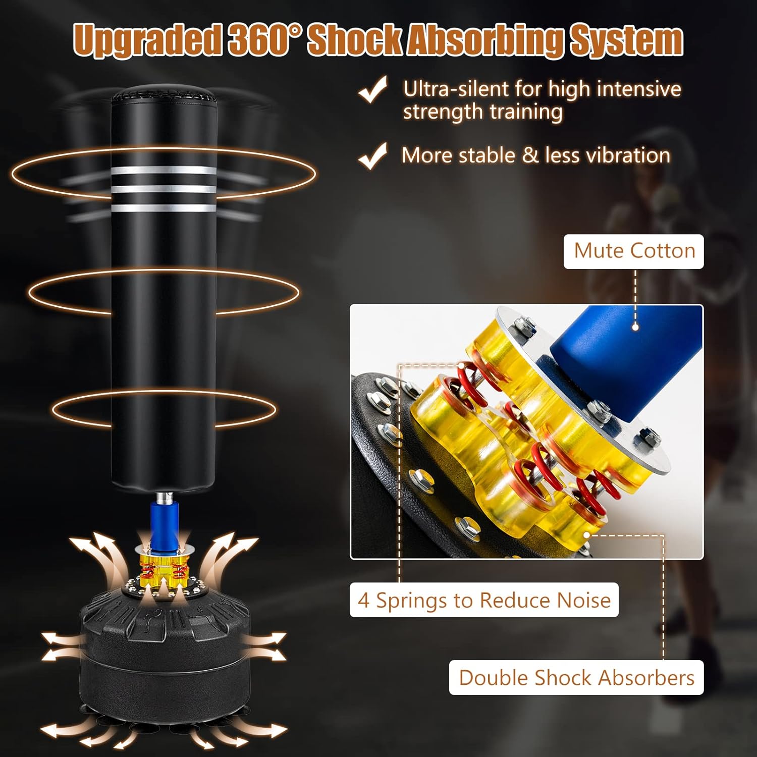 360° Shock & Noise Absorbing: Equipped with double high strength shock absorbers, 4 high elastic springs and thick mute cotton, this freestanding punching bag can achieve 360° shock and noise absorption.