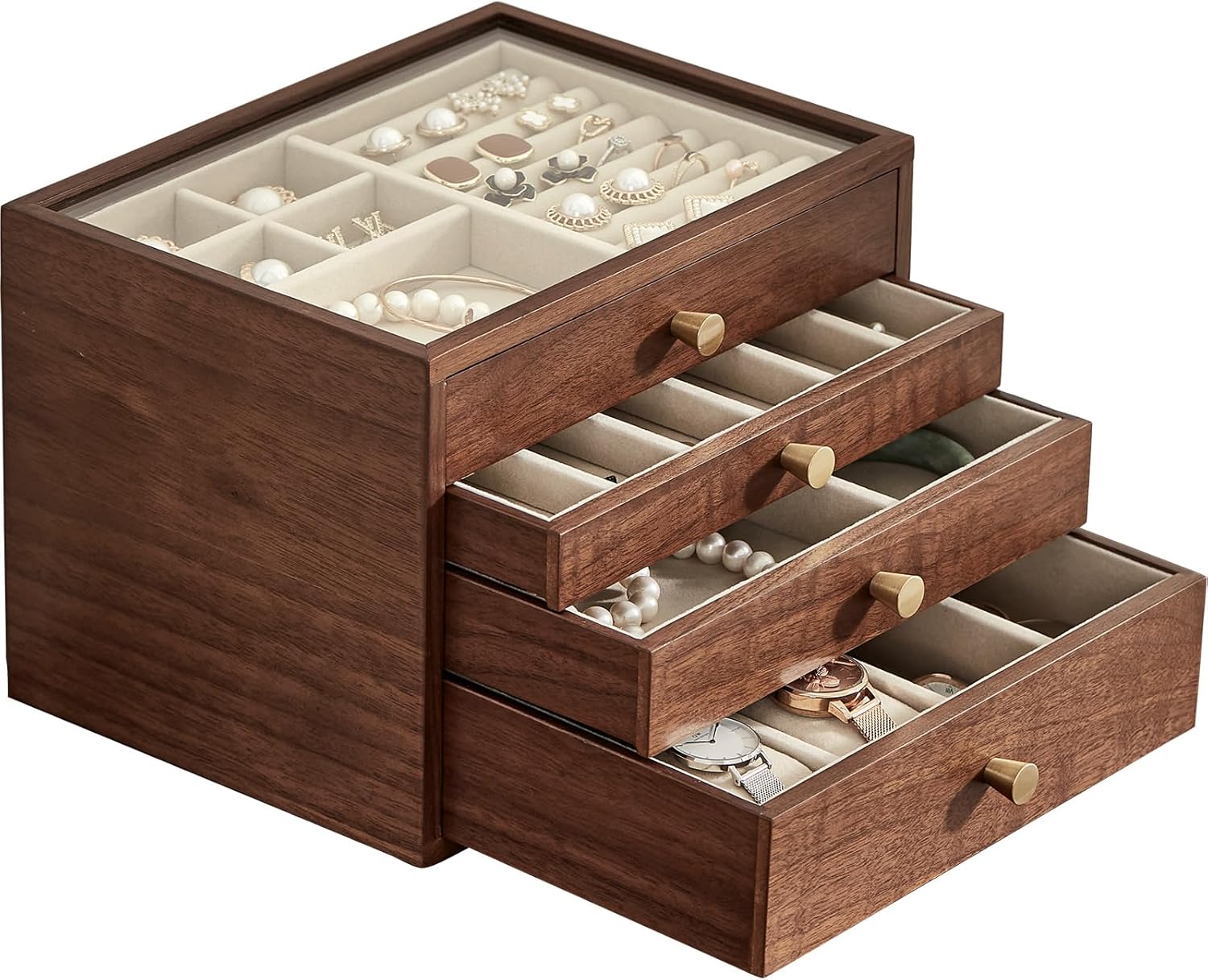 Homruilink Black Walnut Wooden Jewelry Box for Women large 4 Layer Drawer Organizer Box with Glass Lid for Necklaces, Watch, Necklace, Ring, Earring Storage Gift Idea