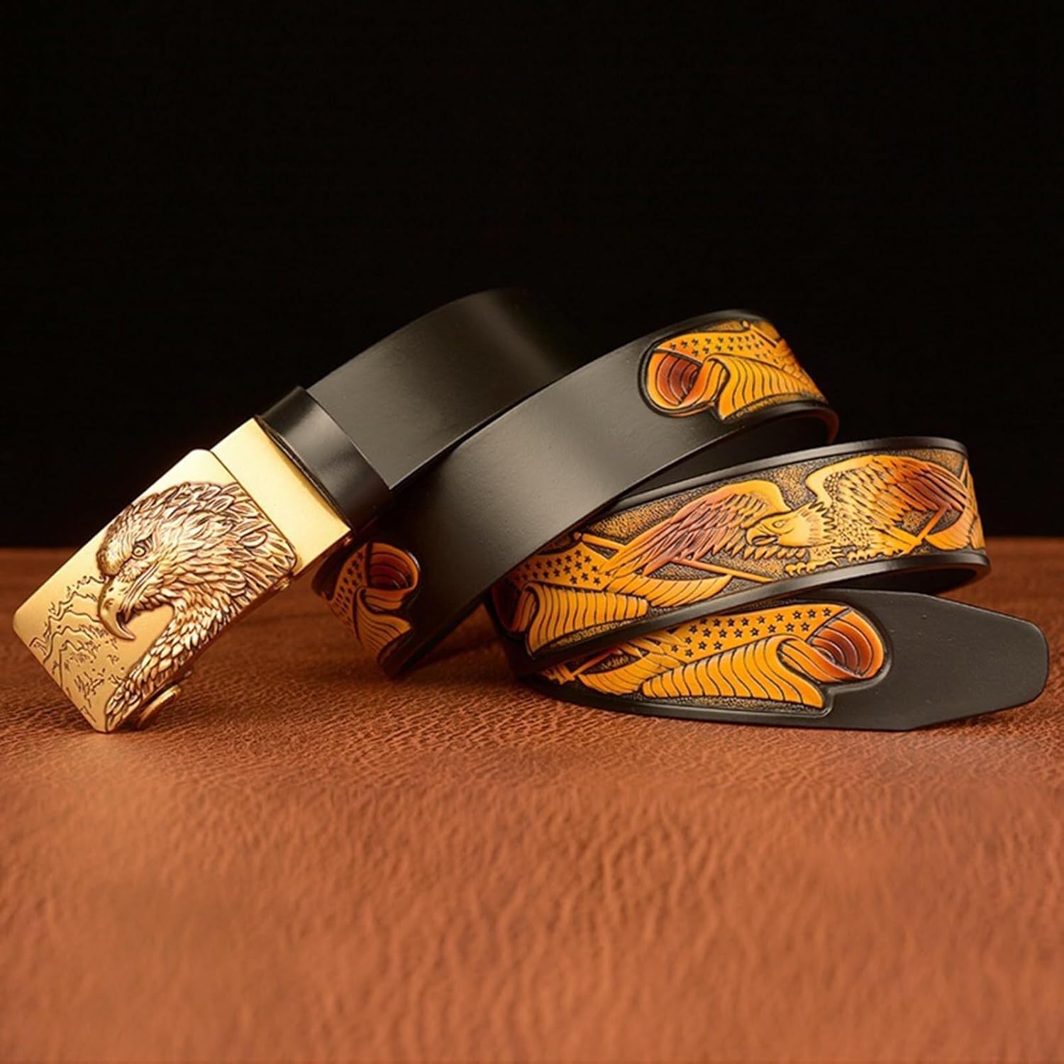 Be the first to review “Leather Belt for Mens Eagle Pattern Sliding Automatic Ratchet Buckle Carved Gold Eagle Mountain,Trim To Fit,35mm Wide”