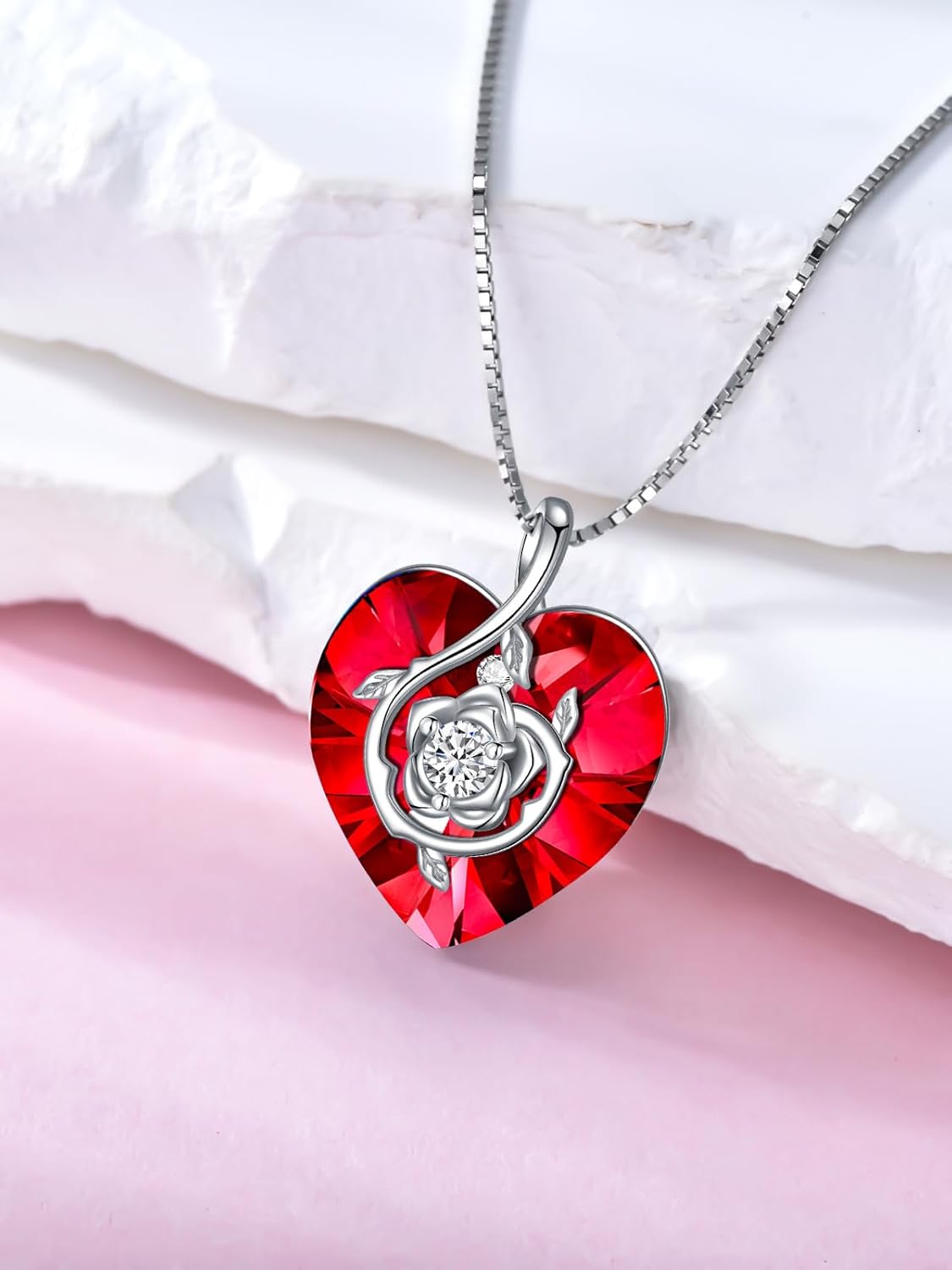 LEKALEIS Heart Rose Flower Necklaces for Women, 925 Sterling Silver Fine Jewelry, Love Heart 12Months Crystal Birthstone Necklaces Birthday Anniversary Christmas Gift for Women Her Wife Mom Girlfriend Lady