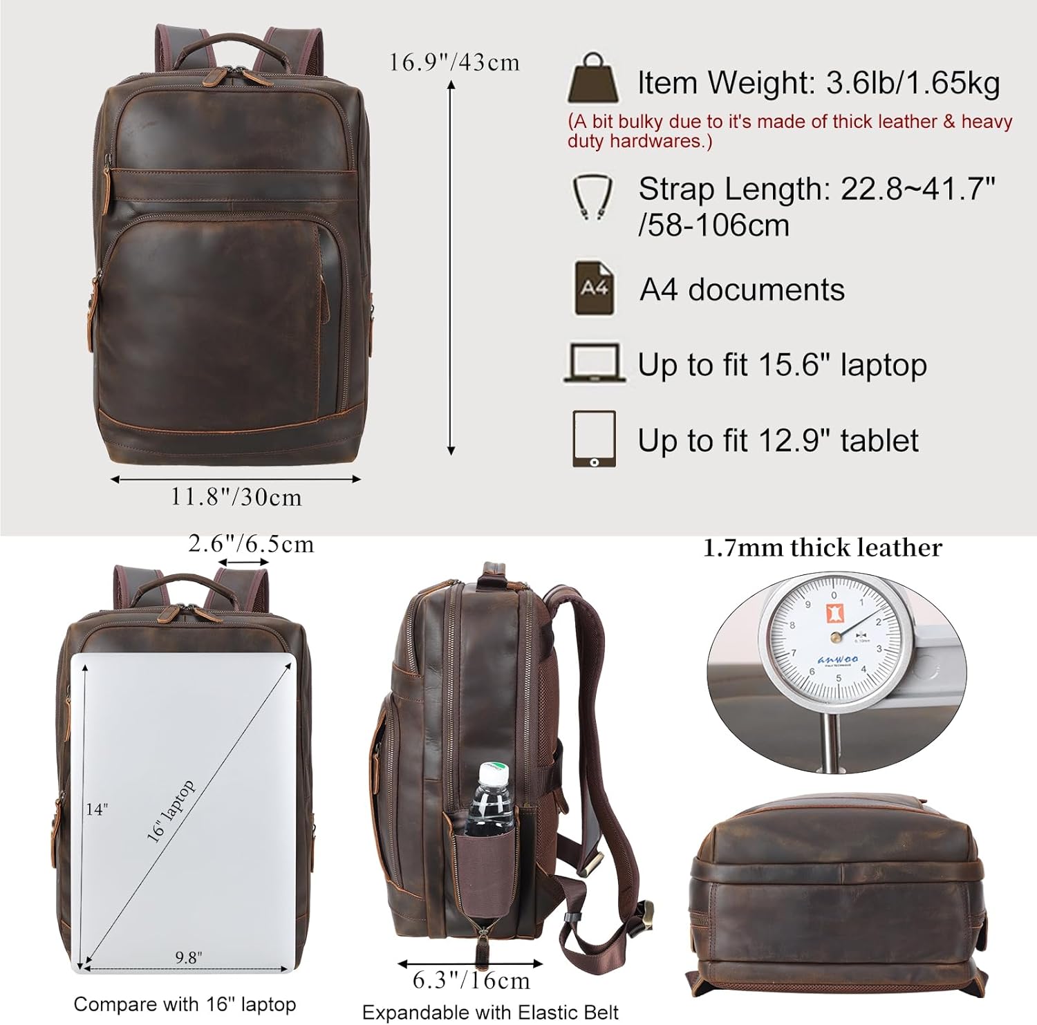 - Premium Material–The laptop backpack is made of 1.7mm thick full grain cowhide leather, outfitted with ykk metal zippers, customized thick metal hardware. The distinguishing feature of leather is its natural disorderly texture that present the style of wildness. It’s looked retro and “scratched” when it’s new, and the more you use the bag, the shinier and ” newer” look the leather will be.
