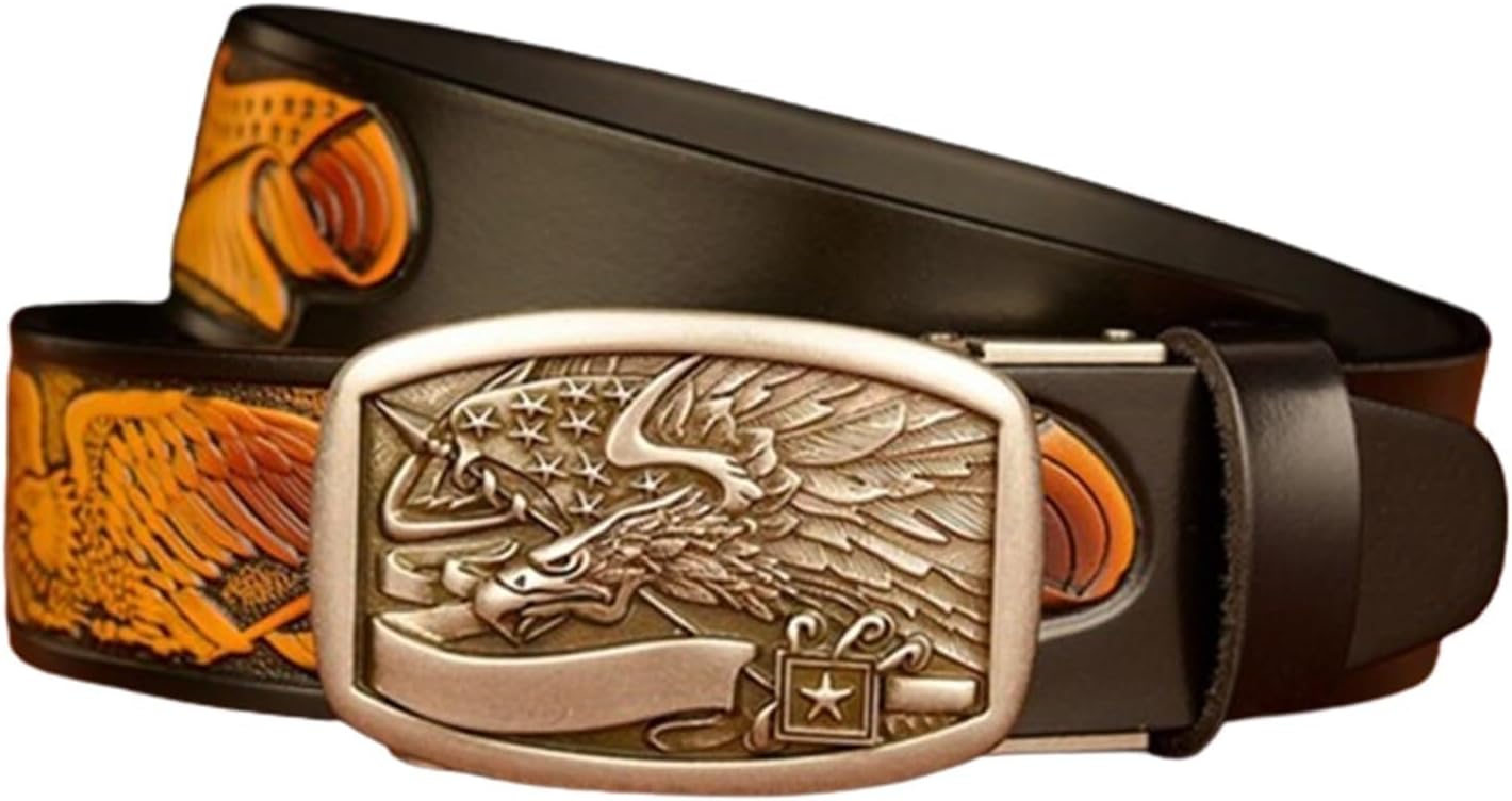 Mens Belts Cowhide Leather Strap Ratchet Dress Eagle Pattern Waistband With Adjustable Slide Silver Buckle 35mm Wide