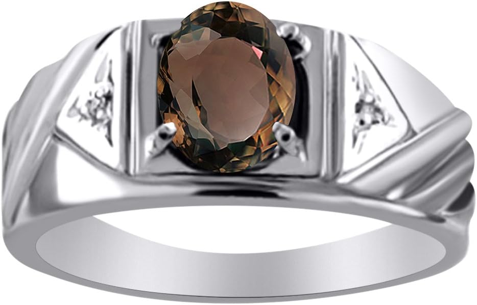 RYLOS Mens Rings 14K Yellow Gold – Diamond & Simulated smokey Quartz Ring 8X6MM Color Stone Gemstone Rings For Men Mens Jewelry Gold Rings