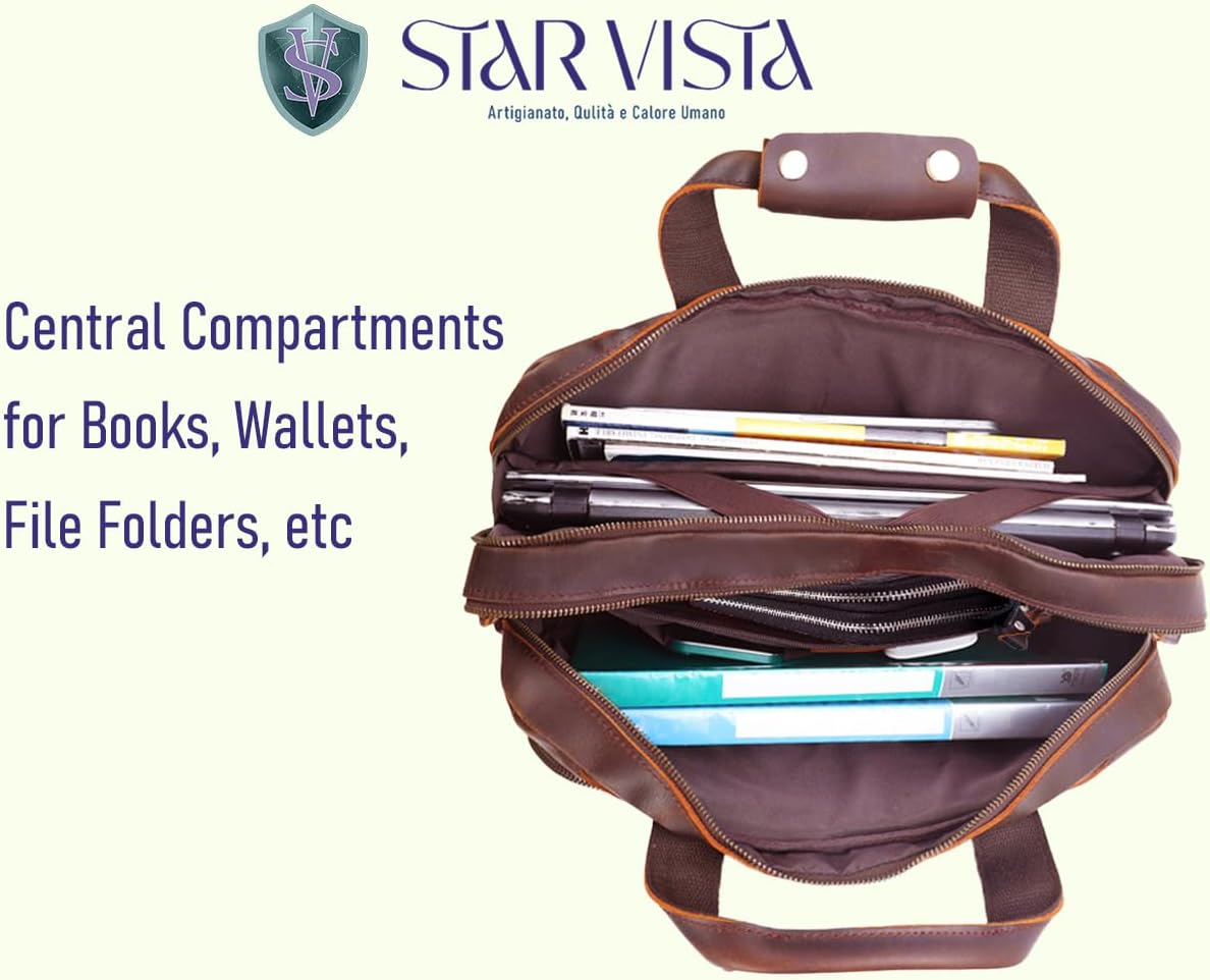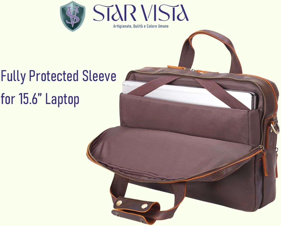 STAR VISTA Brela 15.6″ Laptop Messenger Bag, Full Grain Leather Briefcase for Men, Women, Business Travel, YKK Zippers and Brass Hardware, Dark Brown