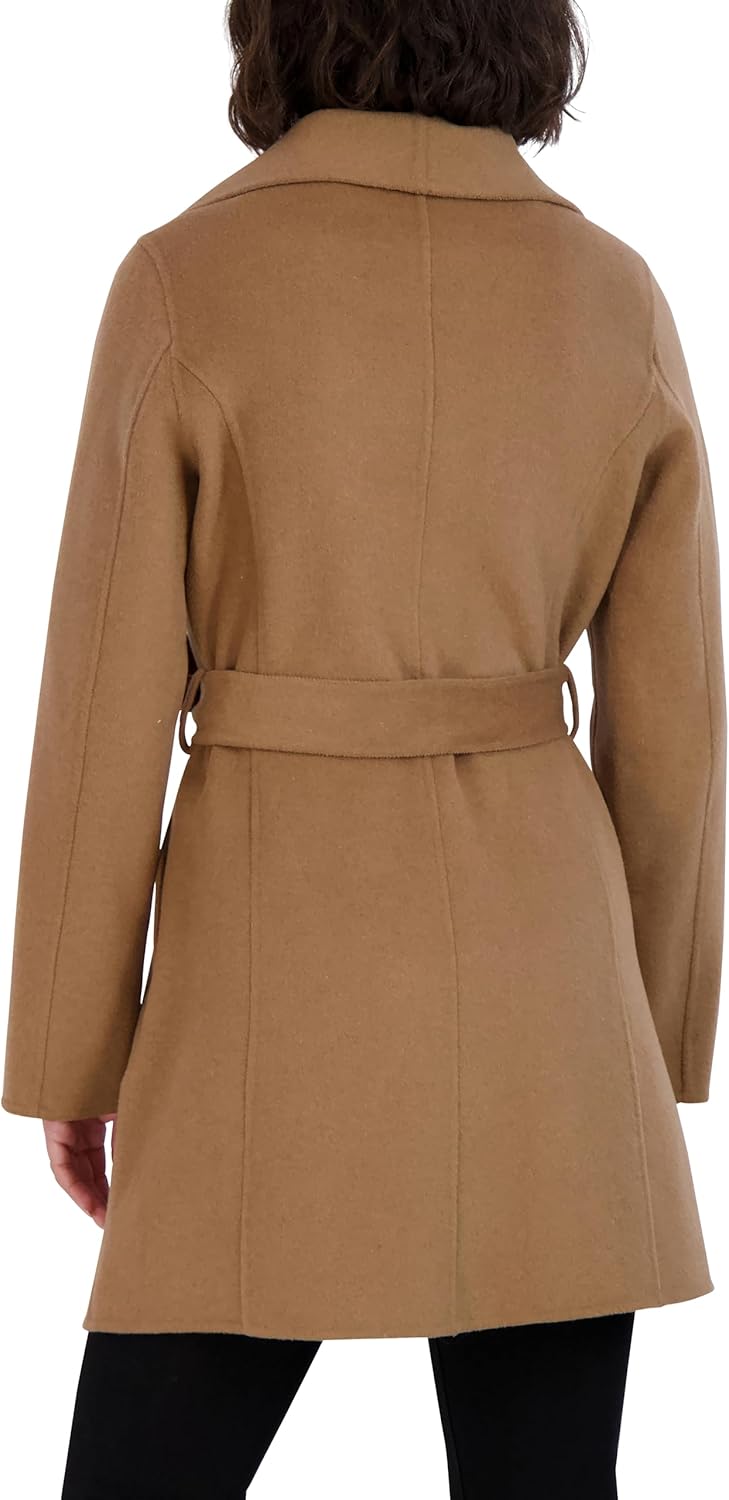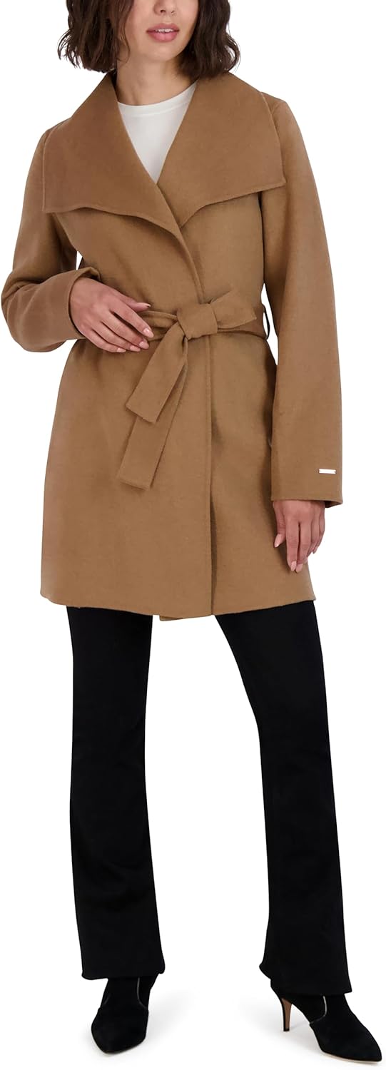 TAHARI Women’s Lightweight Wool Wrap Coat with Tie Belt, Brown Camel, Large