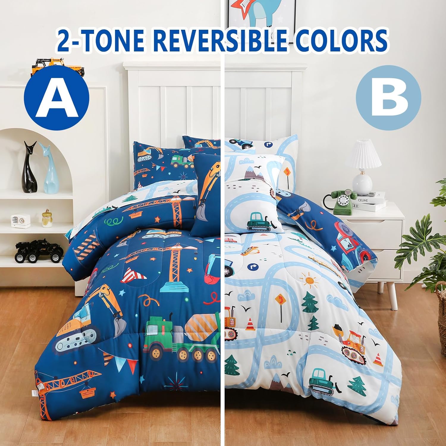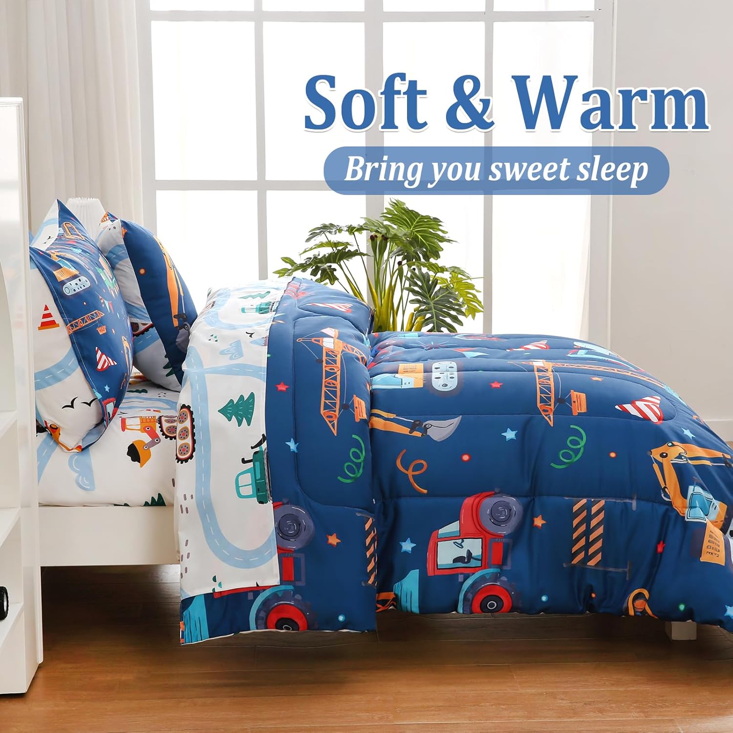 Cute Construction Design — Construction Kids bedding set with a variety of trucks,using the latest 3D printing technology and realistic graphic design are great for kids decorative room for a vibrant and cute look.