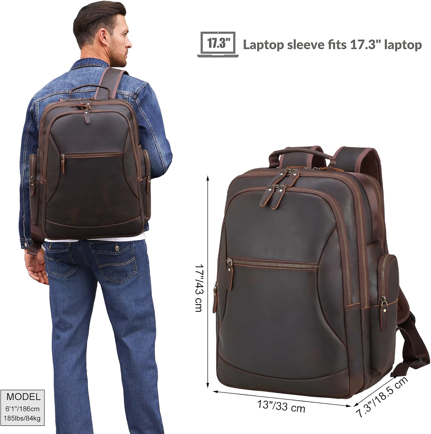 【Material & Dimension】: This large travel backpack is made of durable full grain cowhide leather and heavy duty ykk metal zipper. The new zipper is a little tight at first to extend its life and will become smoother over time. Dimensions: 13″ L x 7.3″ W x 17″ H, weights 4.2lbs(a bit heavy and stiff due to 1.8mm thick leather). The length of adjustable shoulder strap: 21.6″-42.9″.