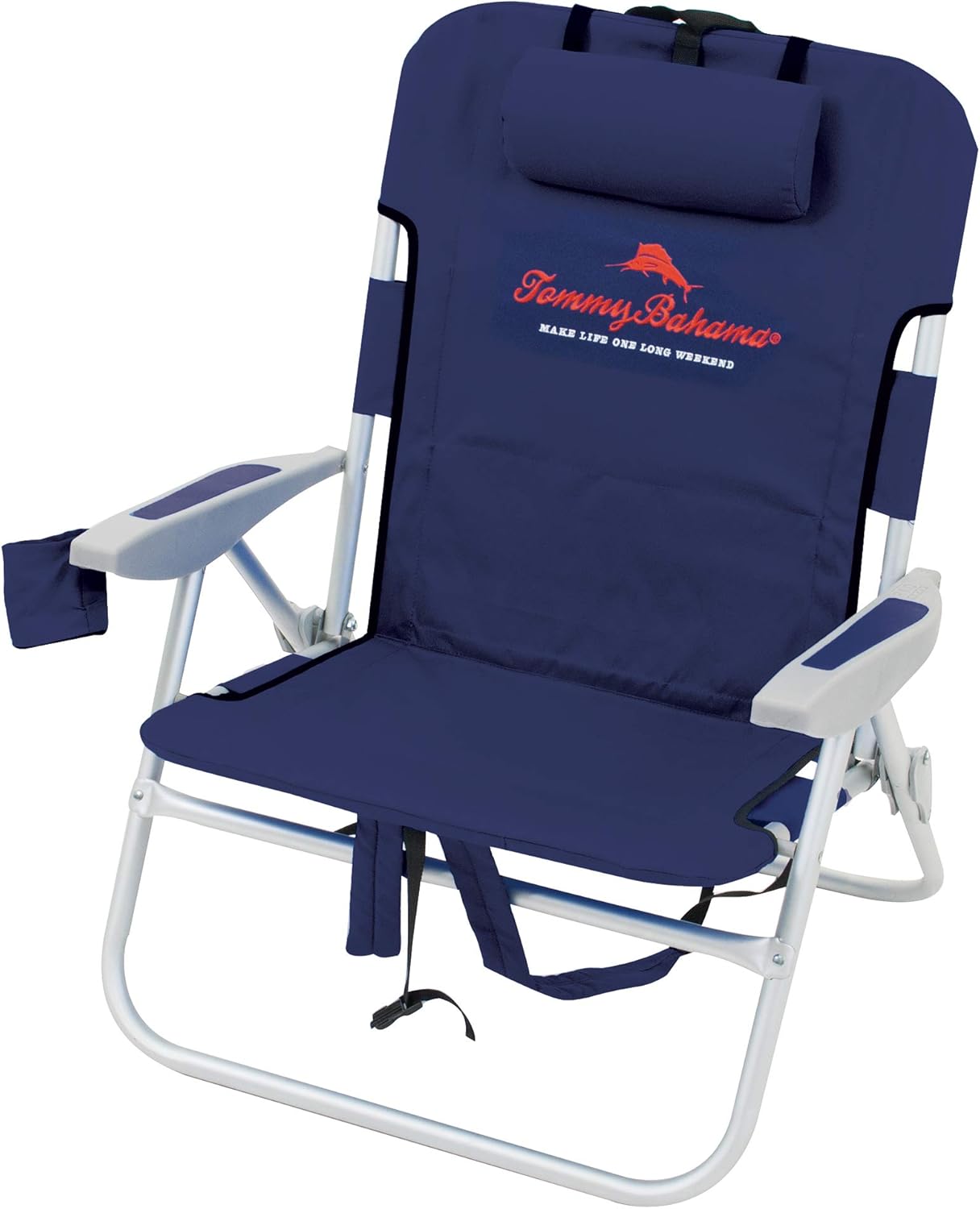 Looking for a little extra room the Tommy Bahama big boy backpack chair has an extra-wide, stronger seat with a sturdy aluminum-frame. It’s full of extras, like a padded headrest that makes laying back all that easier, a drink holder to keep a chilled beverage at hand, and two adjustable padded straps to make transporting this chair a breeze. Weight capacity: 300 lbs.Backpack chairs are patented
