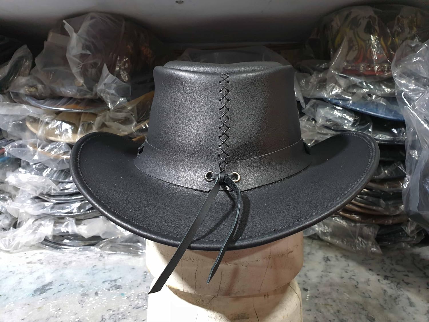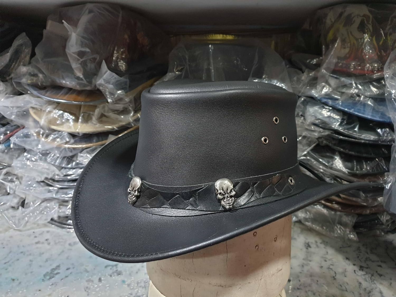 The Cowboy Black Leather Hat with Tri Skull Rivets on Crocodile Textured Leather Patch on Hat Band is a stylish and edgy accessory that combines classic cowboy aesthetics with a touch of modern flair. The hat is crafted from high-quality black leather, ensuring durability and a timeless look. The hat features a classic cowboy design, with a wide brim and a slightly curved crown, giving it an authentic Western feel. The hat is adorned with a unique hat band made from crocodile-textured leather. This adds a touch of exotic and rugged appeal to the overall design. Three skull-shaped rivets are strategically placed on the crocodile-textured leather patch, creating a distinctive and bold accent. The skull design adds an element of edginess and rebellion to the hat. The black leather base, combined with the crocodile texture and skull rivets, creates a cohesive and eye-catching color scheme. The dark tones contribute to the hat’s mysterious and adventurous vibe. This hat is versatile enough to be worn for various occasions, whether you’re out for a casual day in town, attending a concert, or embracing your inner cowboy at a Western-themed event. The hat is designed for comfort, featuring a 4.5″ Crown, 3″ Brim and Moisture wicking velvet fabric elastic sweatband protects the hat from your perspiration and adds comfort while worn. With its unique combination of textures and skull rivet embellishments, this hat becomes a statement piece that showcases individuality and a bold sense of style. Whether you’re a cowboy at heart or just looking to make a fashion statement, the Cowboy Black Leather Hat with Tri Skull Rivets on Crocodile Textured Leather Patch on Hat Band is sure to turn heads and add a touch of rugged charm to your ensemble. Unisex. Sizes: S: 54-55CM M: 56-57CM L: 58-59CM XL: 60-61CM XXL: 62-63CM
