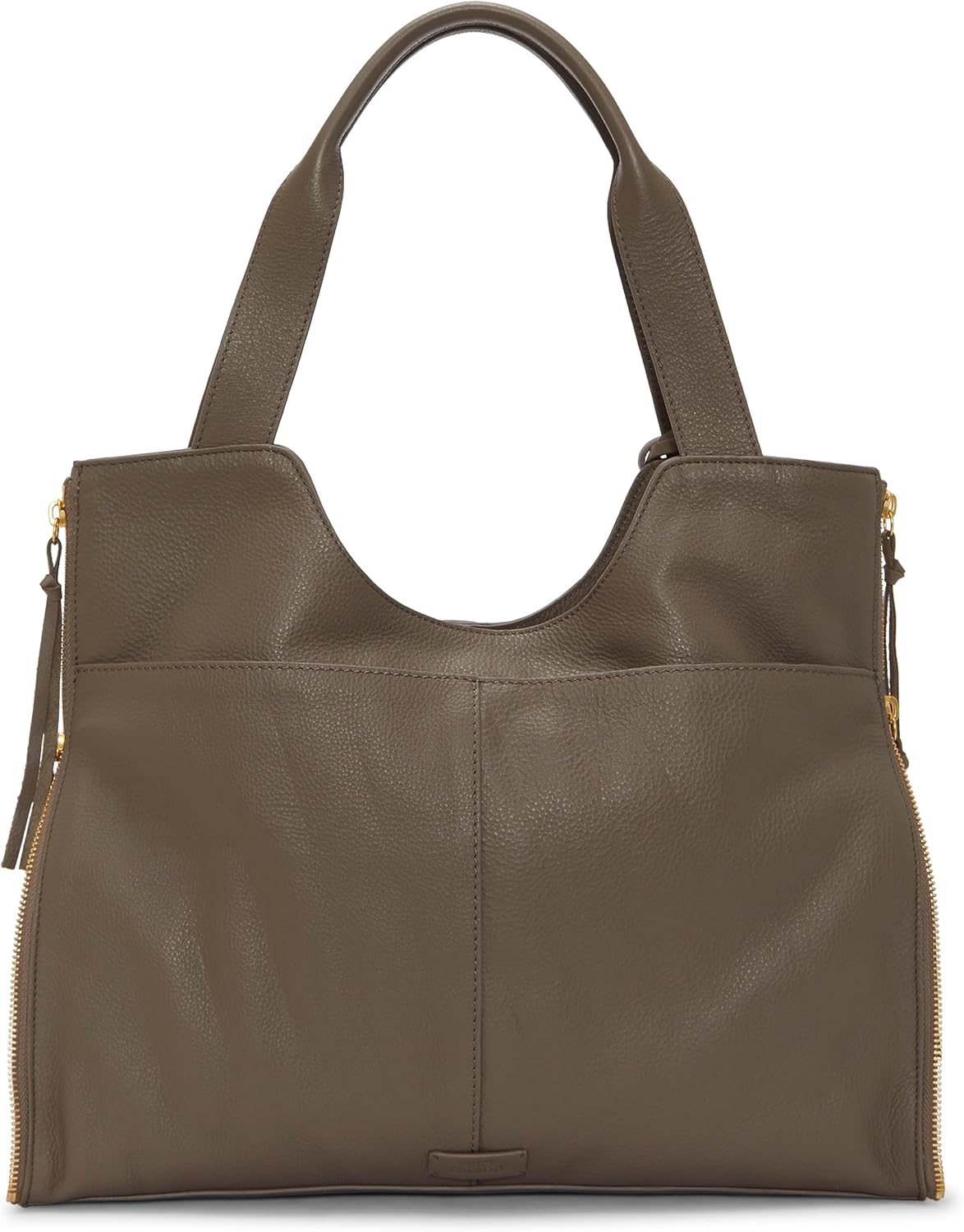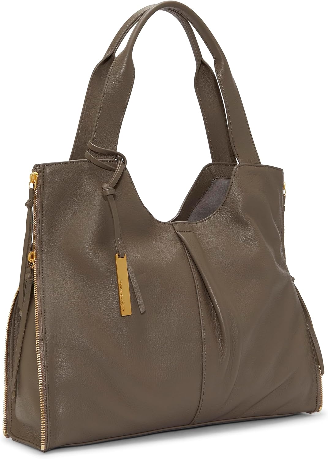 Fashioned of soft pebbled leather, the Corla tote from Vince Camuto is cut with a contoured topline and box pleat. Zip gussets with tassel pulls allow for easy expansion. The bag’s detachable leather fob and logo plate add movement and a hint of shine.