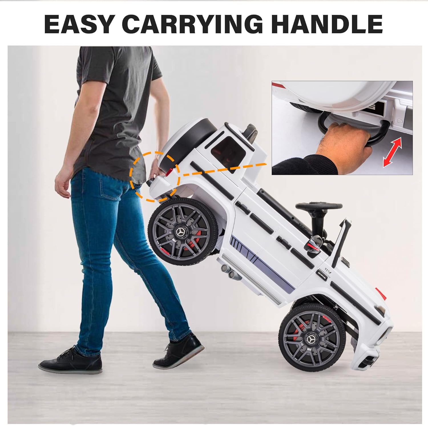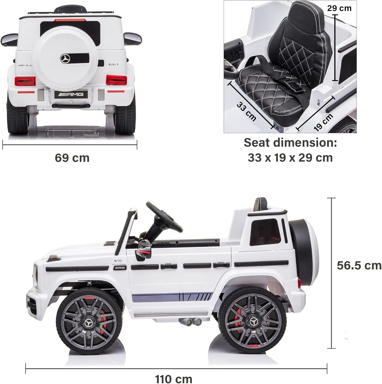 【THE REALISTIC Mercedes-Benz AMG G63 DESIGN】Officially licensed Mercedes-Benz kids ride on car includes the classic Mercedes-Benz and AMG logo, unique round headlights and spare tire design, openable side-doors for easy and convenient accessibility, a luxury leather seat and a complete external and interior design.