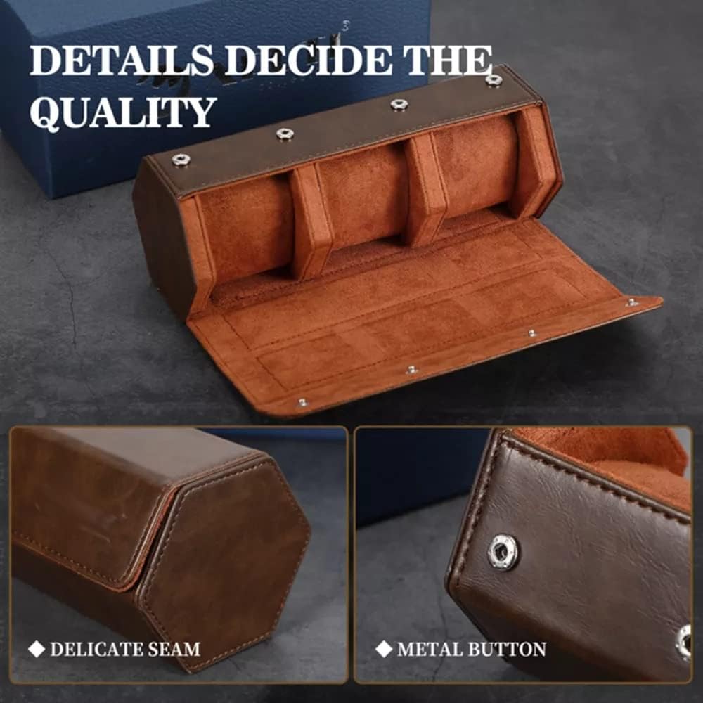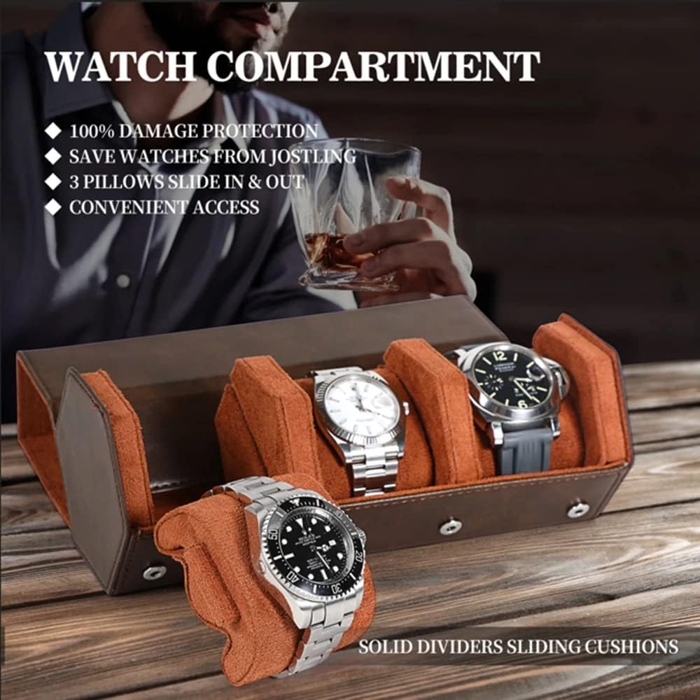 Material:Microfiber Reinforced leatherWatches that can be accommodated:3 piecesWatch box– Unlike others, our watch organizer features an individual watch compartment for 100% separation and damage protection.Handcrafted design : Our 3-Slot watch case is handcrafted from naturally-tanned espresso premium grade PU leather. Its in-depth features, fine accent stitching finish, soft touch of suede, sturdy construction and four silver strong snaps closure that secures everything for you.Holds 3 Watches:Our watch case could hold 3 watches, great partner for your home and travel,journey, weekend trip, business trip use, It is more suitable for large adult watches.Advanced material: Our soft oval pillow will easily fit small to large wristwatches. Three pillows were innovatively designed to slide in and out from each compartment will not compromising the structural core of the watch case.A BEAUTIFUL GIFT:Our handcrafted watch roll case for storage, travel and display. Designed for those who believe that a their watches. This gift is a great way to express your heart.A Best Gift To Yourself & To All Watch Lovers!Package included:1 * storage box (not inlclud any watches.)Notes:1. Please allow 0-1 inch error due to manual measurement. Thanks for your understanding.2. Monitors are not calibrated same, item color displayed in photos may be showing slightly different from real object.Due to different lighting and screen settings, the color of the item may be slightly different from the picture.Please allow for slight size differences due to manual measurements.Package includes main product only