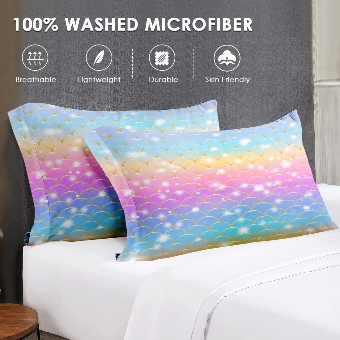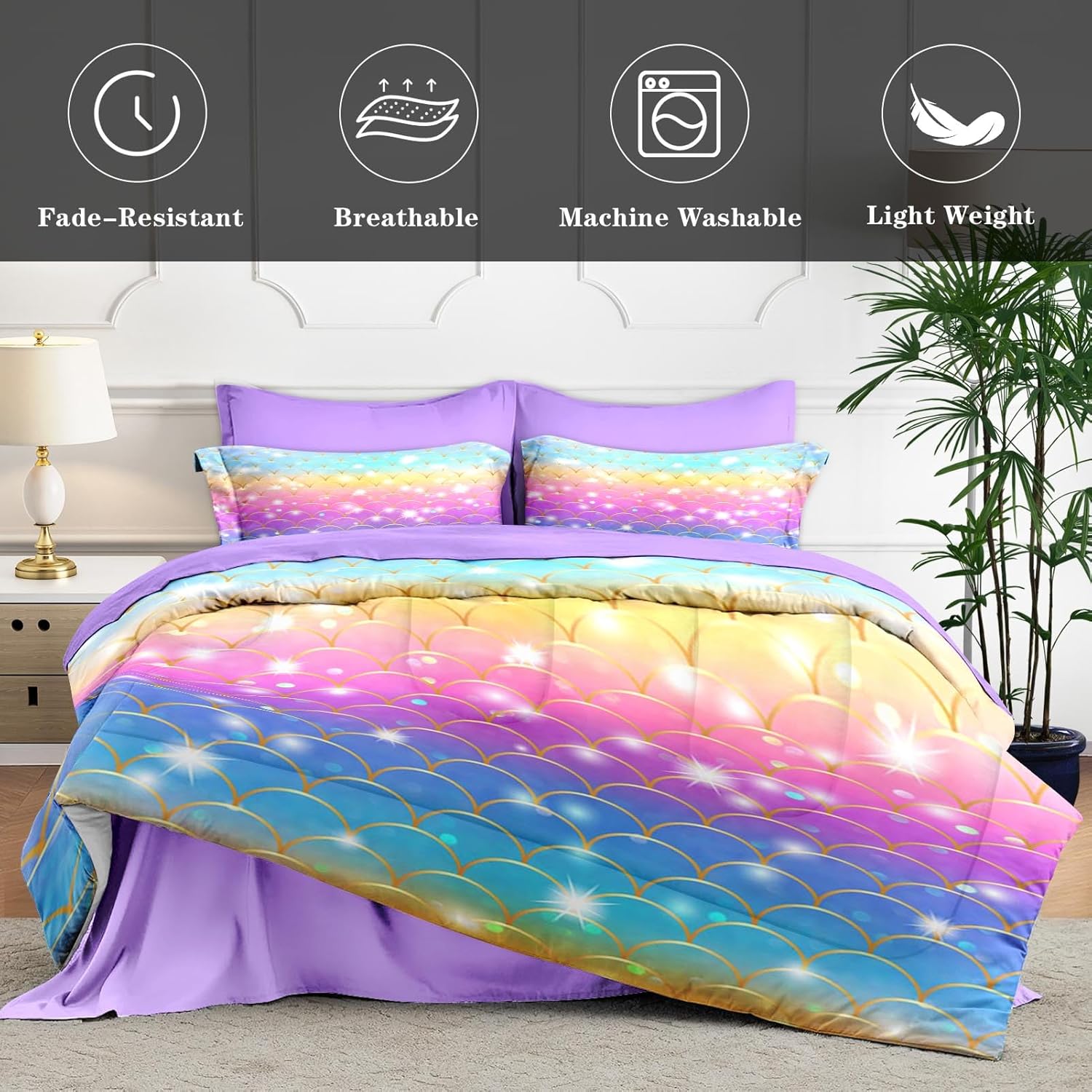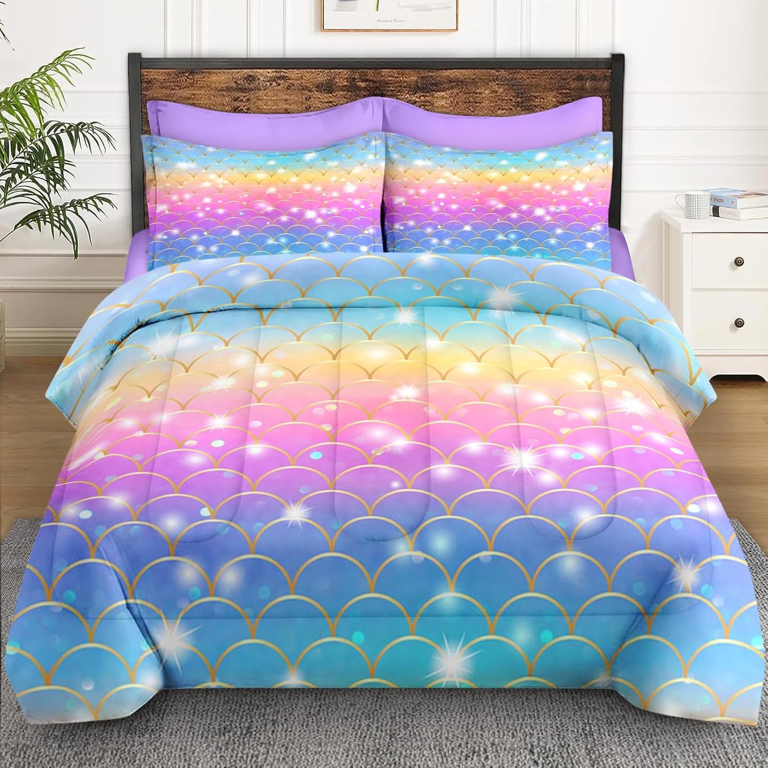 WeCozy Queen Size Comforter Set with Pillowcase & Sham, Ocean Bubbles Mermaid 7 Pcs Bedding Set for Kids and Adults, Purple Pink Rainbow Scales Bed in a Bag with Flat Sheet and Fitted Sheet