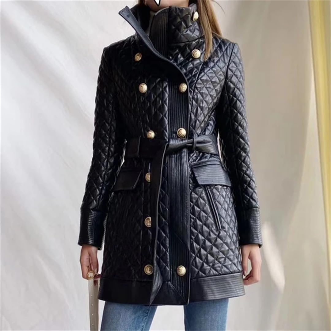 Women Stand Collar Double-Breasted Lace-Up Belt Mid Length Lambskin Jacket Real Sheepskin Coats