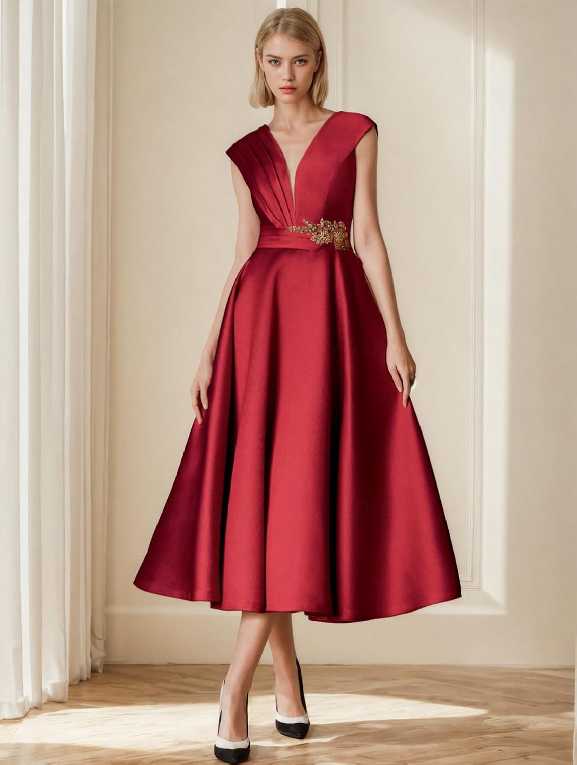 Xzarvion A Line Vintage Wedding Guest Dress Satin Tea Length Cocktail Party Dress V Neck Sleeveless Belt/Sash Rhinestone 2024, Burgundy, 16