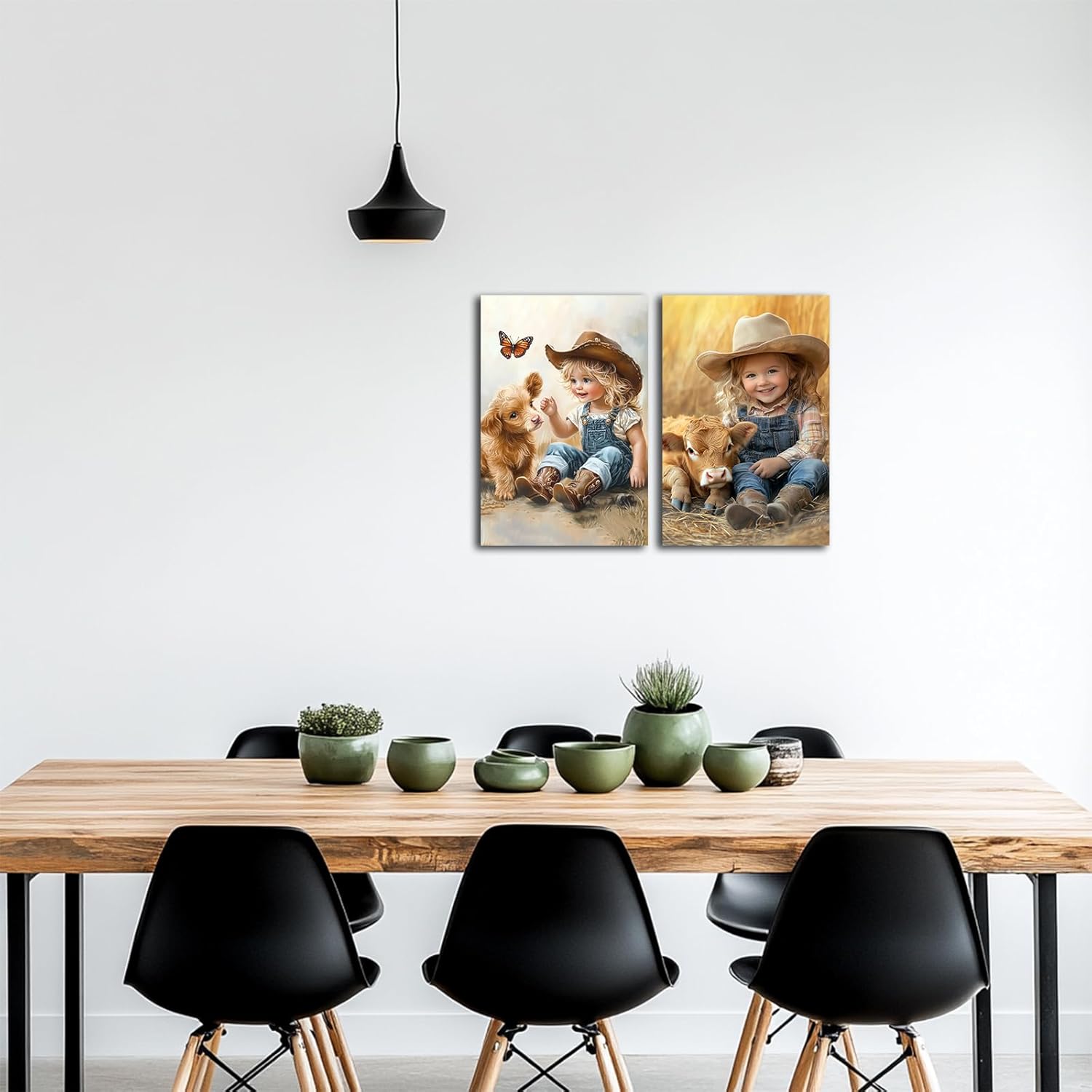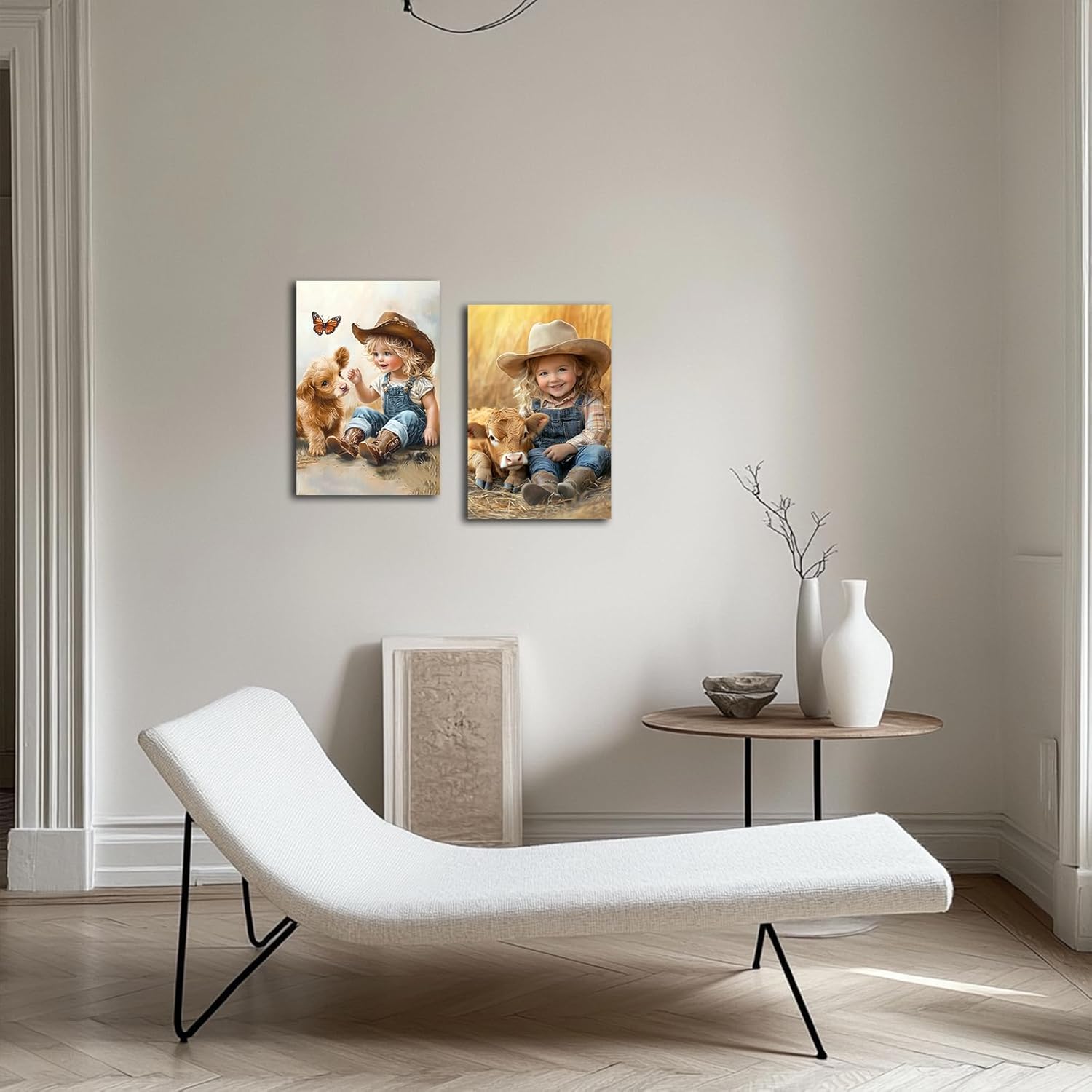 YMXDYMJSW Western Cowgirl Wall Art Nursery Decor 2 Pieces Cute Girl and Cow Canvas Pictures Rustic Farm Scene Poster Prints for Baby Girl Bedroom Framed (Orange,24.00″ x 36.00″ x 2PCS)